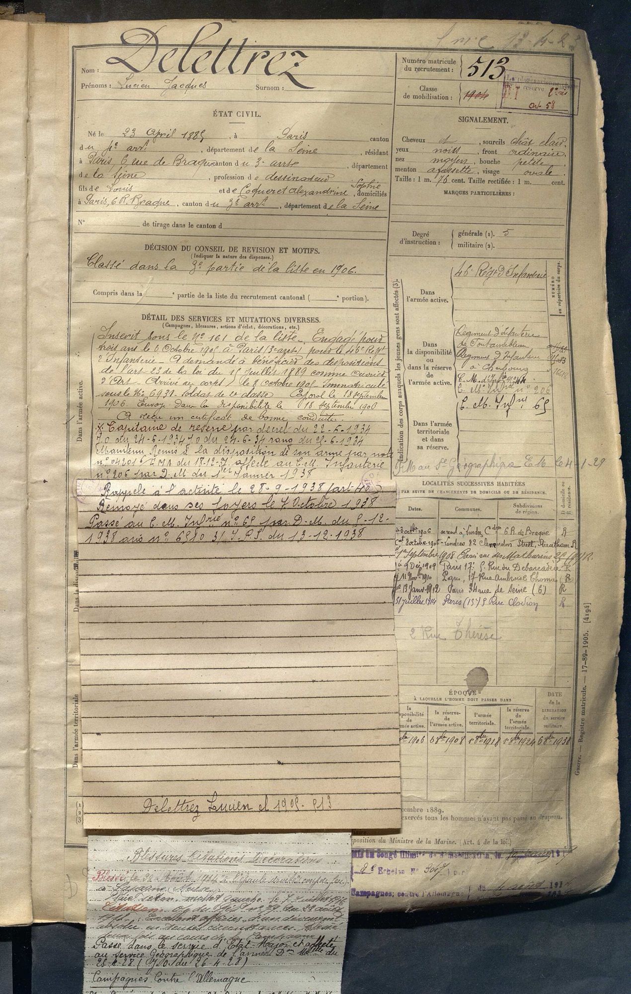 Delettrez Lucien Jacques Date de naissance 23/04/1885 Département ou pays de naissance Seine Numéro de matricule 513 Bureau de recrutement 4e bureau Classe 1905 Cote D4R1 1325