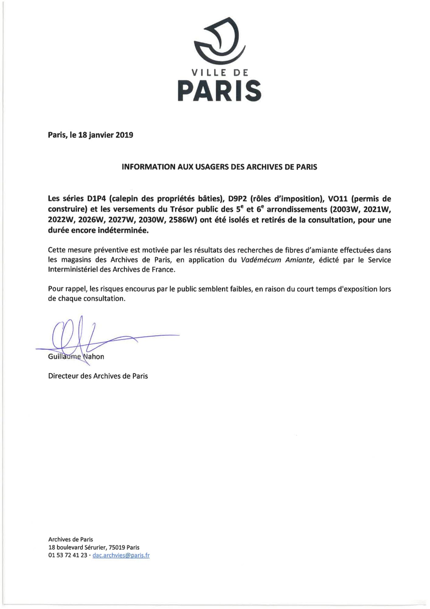 En application du Vadémécum amiante édicté par le Service interministériel des Archives de France, des recherches de fibres d'amiante ont été faites dans les fonds des Archives de Paris.