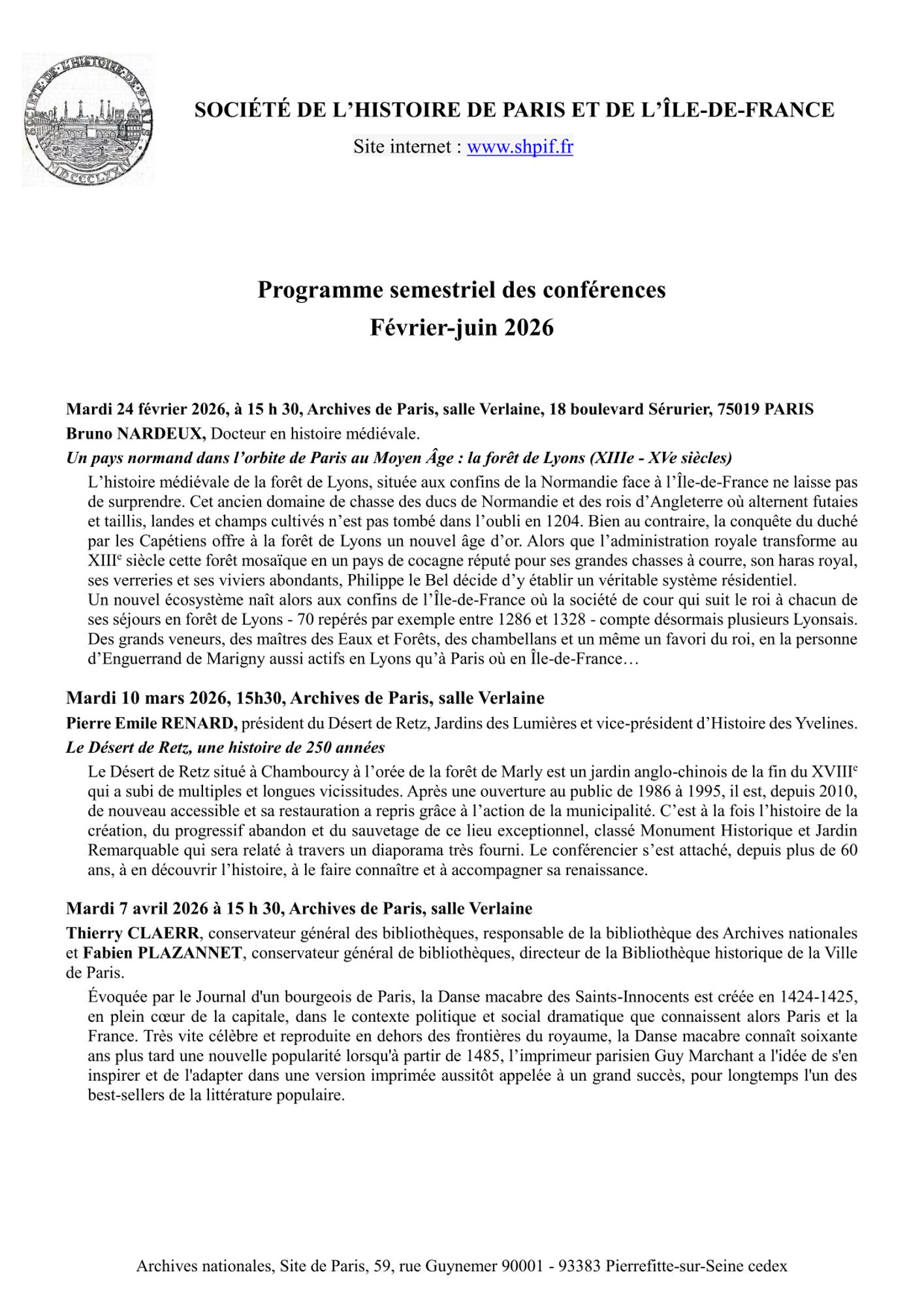 Les conférences organisées par la Société de l'Histoire de Paris et de l'Île-de-France ont lieu les mardis, à 15h30.