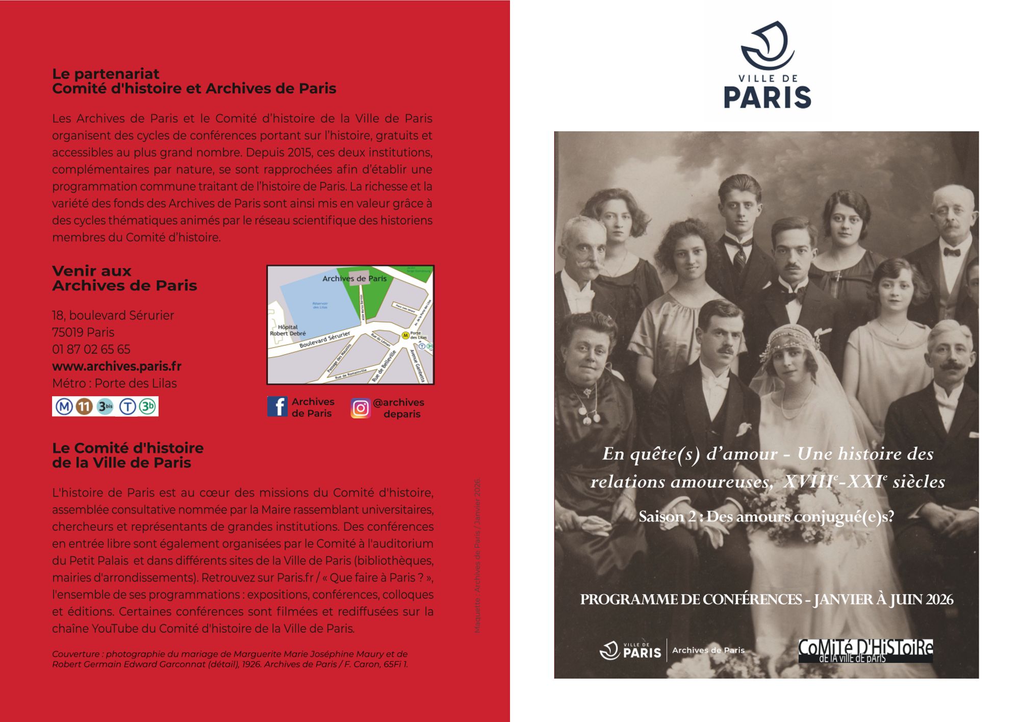 Les Archives de Paris et le Comité d'histoire de la Ville de Paris poursuivent durant une deuxième saison leur enquête sur l'histoire des relations amoureuses, officielles ou secrètes, célébrées ou surveillées. Après avoir observé, l'automne dernier, les modalités de la rencontre amoureuse, les conférences programmées de janvier à juin étudient les formes de la conjugalité et s'intéressent aux vies de couple dans l'intimité et dans la société. Les recherches récentes qui seront présentées renouvellent l’histoire des sociabilités, l'histoire des sensibilités, l'histoire des sexualités.