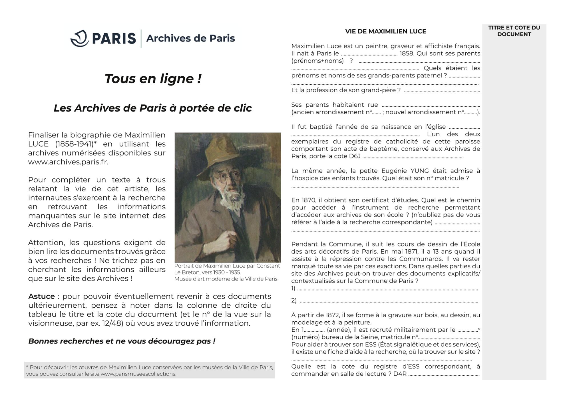 Pour vous entraîner et tester vos connaissances à partir de nos ressources en ligne, retrouvez le questionnaire de recherche sur la vie de Maximilien Luce et son corrigé :