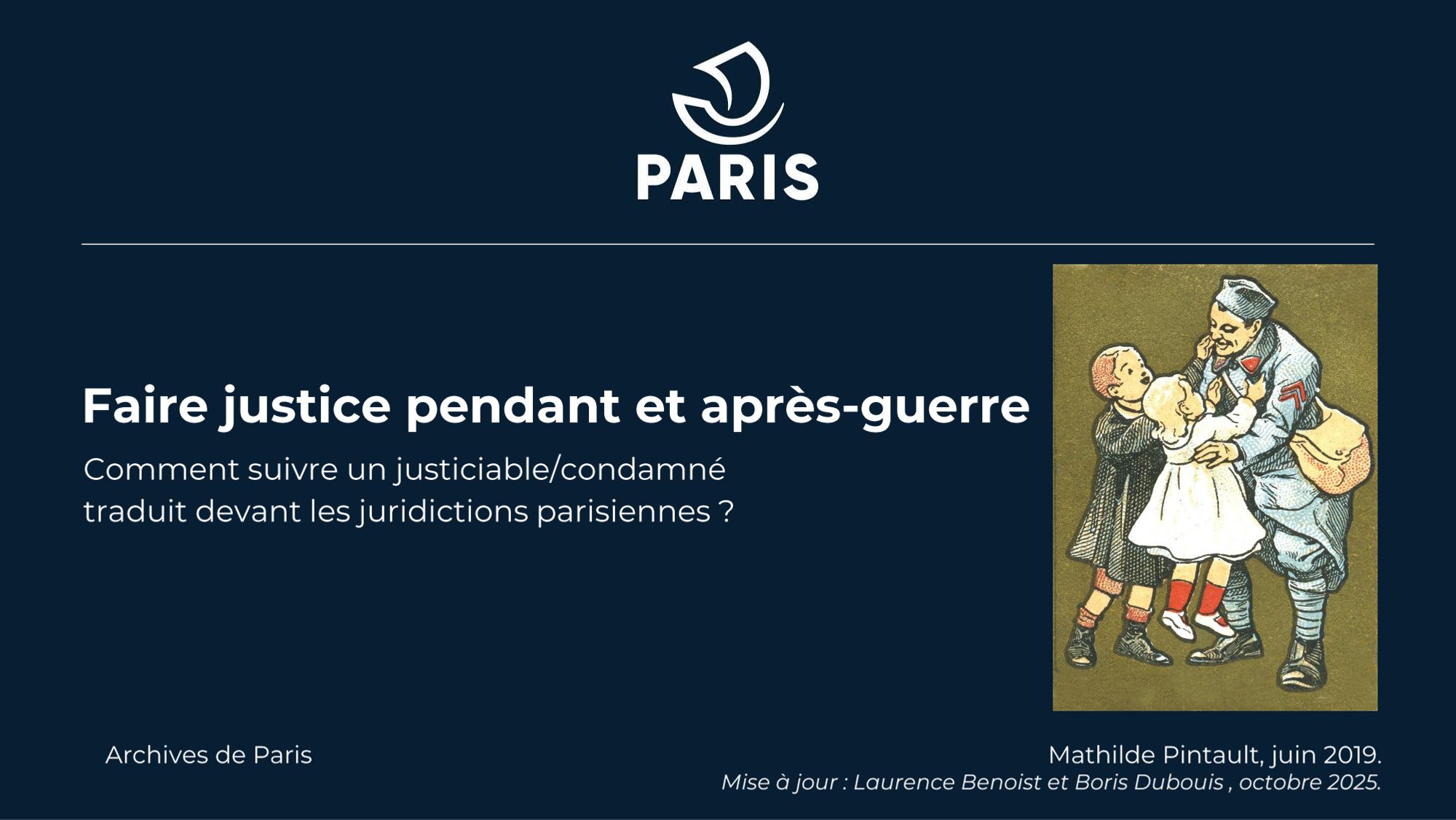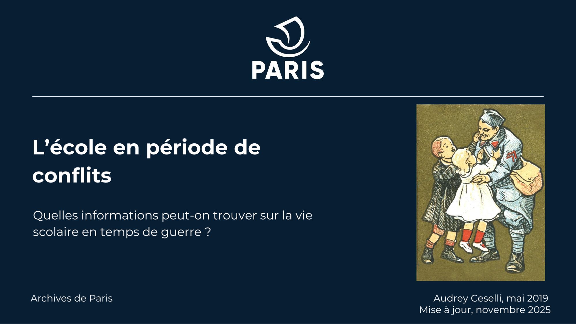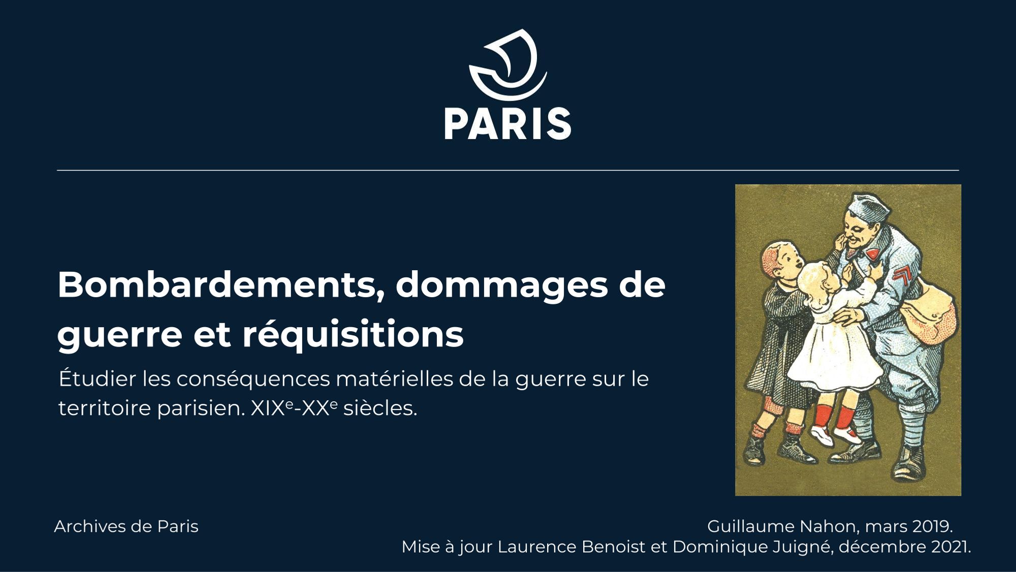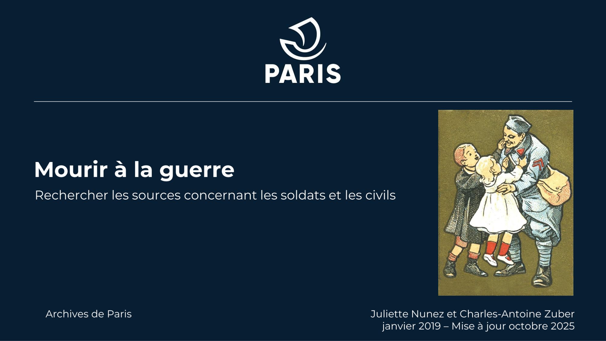 Saison 2018-2019 : Militaires et civils en temps de guerre Programme du cycle de cours d'initiation à la recherche, saison 2018-2019 (4.8 Mo) Janvier 2019 Mourir à la guerre, par Juliette Nunez et Charles-Antoine Zuber. (11.3 Mo) Février 2019 Survivre à la guerre, par Boris Dubouis. (6.7 Mo) Mars 2019 Faire une recherche dans le fonds des dommages de guerre (8.8 Mo) Mai 2019 L'école en période de conflits : quelles informations peut-on trouver sur la vie scolaire en temps de guerre ? par Audrey Ceselli. (12.1 Mo) La spoliation des biens juifs. par Vincent Tuchais. (23.5 Mo) Juin 2019 Faire justice pendant et après-guerre : comment suivre un justiciable/condamné traduit devant les juridictions parisiennes ? par Mathilde Pintault. (12.6 Mo)