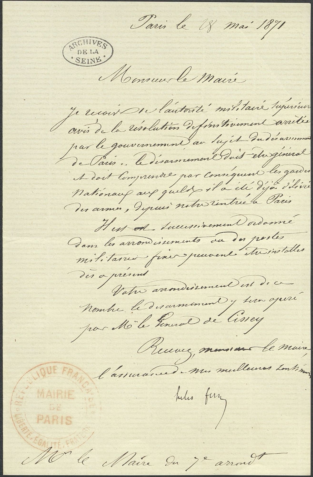 Avec le retour de l’ordre, les arrestations, les procès, les persécutions, les déportations et les exécutions vont commencer. Il faut punir : la Commune sera la dernière révolte parisienne. Zone de guerre, Paris est sous contrôle militaire. On désarme la population.