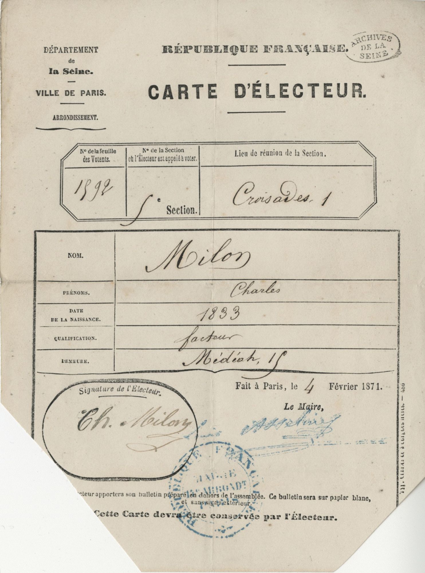 Le 28 janvier 1871, le gouvernement demande l’armistice, mesure inacceptable pour les Parisiennes et Parisiens qui ont tenu le siège pendant quatre mois. L’Allemagne annonçant qu’elle ne traitera qu’avec un gouvernement issu d’une assemblée élue, des élections sont organisées le 8 février 1871. Paris élit une majorité de candidats républicains, mais dans l’ensemble du pays, les monarchistes, légitimistes et orléanistes, représentent la majorité des députés élus. Adolphe Thiers, député conservateur est nommé chef de l’Exécutif. Ses priorités sont de conclure la paix avec l’Allemagne et de percer l’abcès révolutionnaire que représente Paris.