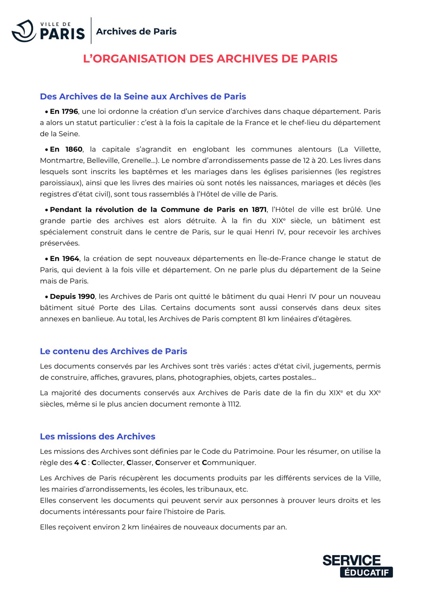 Avant votre venue, nous vous recommandons de télécharger le texte de présentation des Archives de Paris, ainsi que le questionnaire qui l'accompagne, pour sensibiliser vos élèves à ce qu'est un service d'archives municipales et départementales.