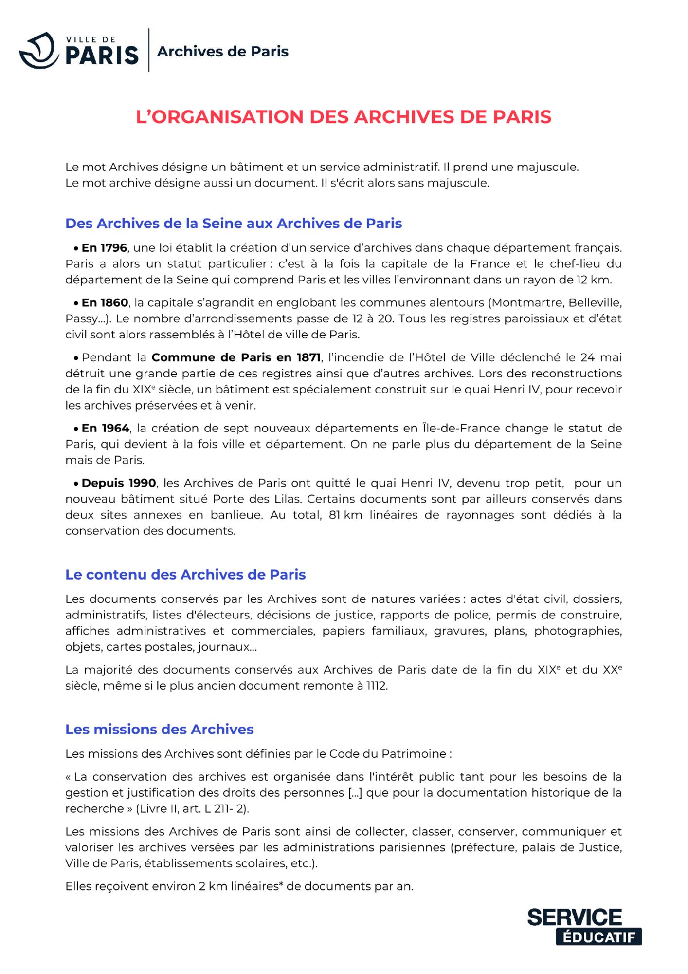 Le service éducatif des Archives de Paris a pour vocation d'offrir aux enseignants de Paris et d'Île-de-France et à leurs élèves, une approche particulière de l'histoire de la capitale en mettant à leur disposition des documents originaux.