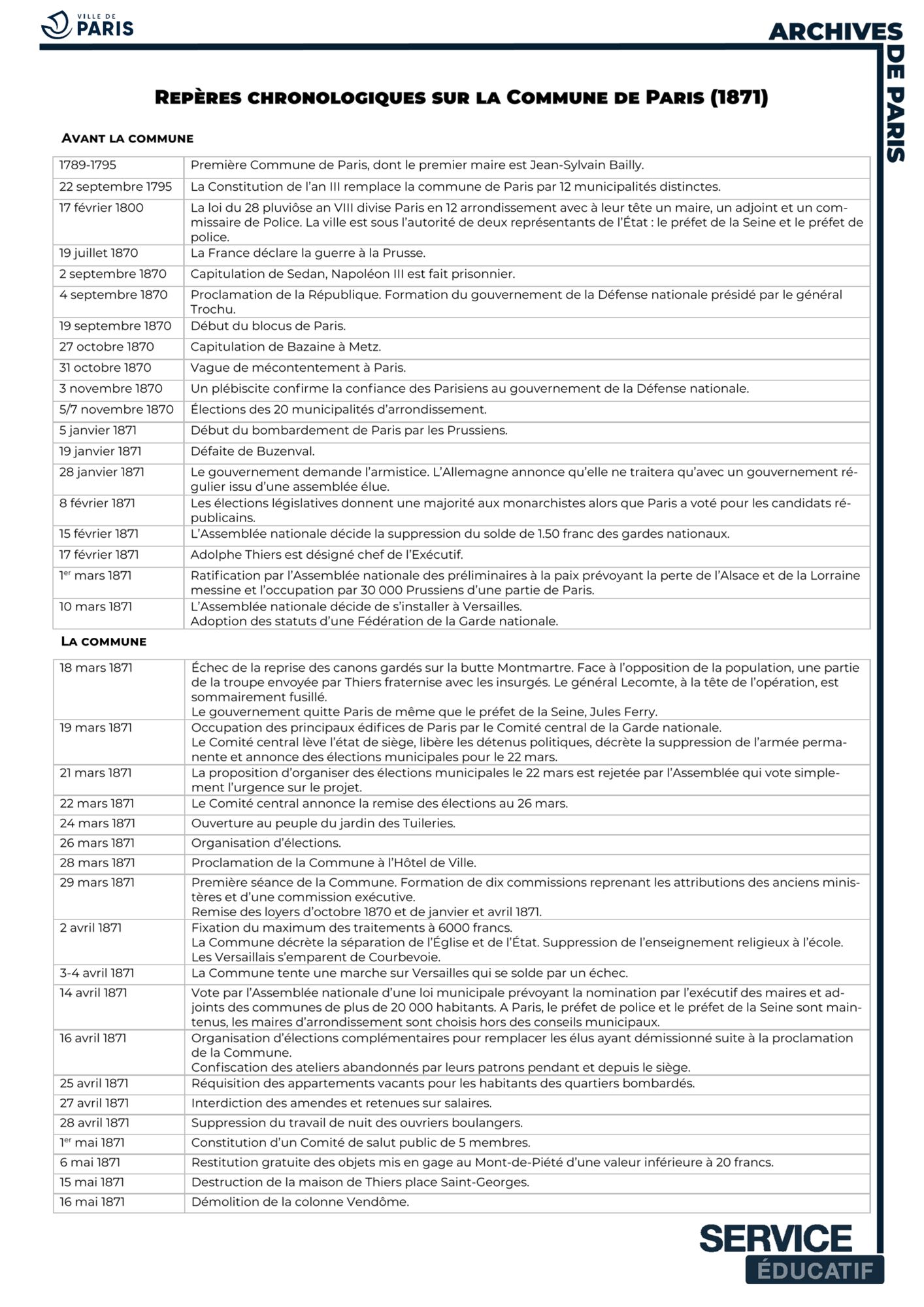 Conservant dans leurs fonds de nombreux témoignages de cette période, les Archives de Paris mettent à la disposition des enseignants une sélection de documents permettant d’évoquer avec leurs élèves les différents aspects de la Commune de Paris. Ces lettres, documents administratifs, gravures, photographies ou plans, pourront servir de support pédagogique pour présenter les origines de la Commune, ses réalisations, ses acteurs et sa postérité. Ils pourront, pour certains, permettre aussi d’illustrer des thématiques développées en instruction civique et morale : égalité hommes-femmes, laïcité, vote et élections, justices administrative et pénale, l’engagement, la défense, les symboles de la République…