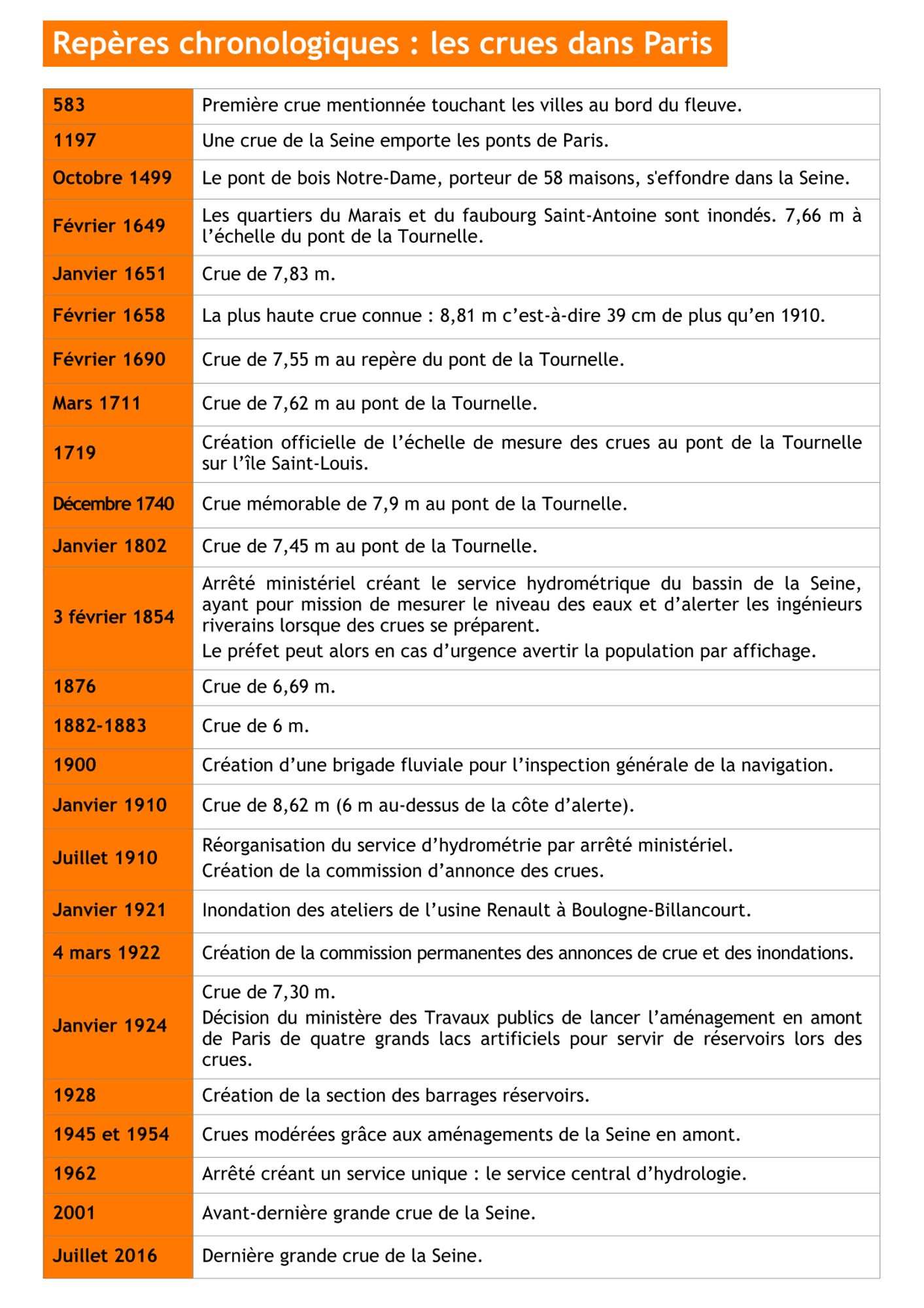 La capitale a pourtant connu d’autres épisodes de crue durant son histoire. Dès l’Antiquité, les premiers habitants se sont installés sur les îles de la Seine, zone protégée des agressions extérieures mais aussi menacée par les inondations d'un fleuve dont les berges sont basses. Au cours des siècles suivants, le développement de la cité de part et d’autre du fleuve a été ponctuellement marqué par des montées d’eau ravageuses. En décembre 1740, une crue mémorable atteignait déjà 7,9 m au pont de la Tournelle sur l’île Saint-Louis, échelle officielle de mesure des crues depuis 1719.