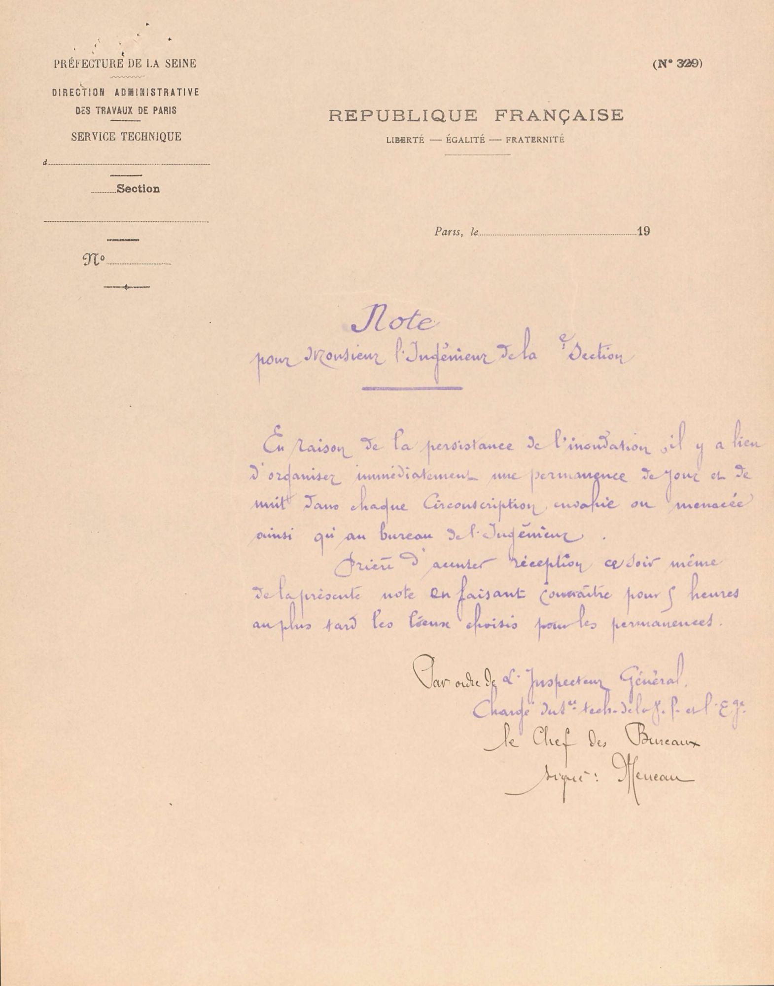 La capitale se distingue également par l’existence d’une préfecture de police autonome : à Paris, le préfet de police intervient dans les affaires d’ordre et de sécurité, il est donc un acteur essentiel en cas de crue. En janvier 1910, c’est ainsi lui qui fait appel au ministre de la Marine pour obtenir une aide particulière et au ministre de l’Intérieur pour rechercher des locaux pouvant abriter les sinistrés.