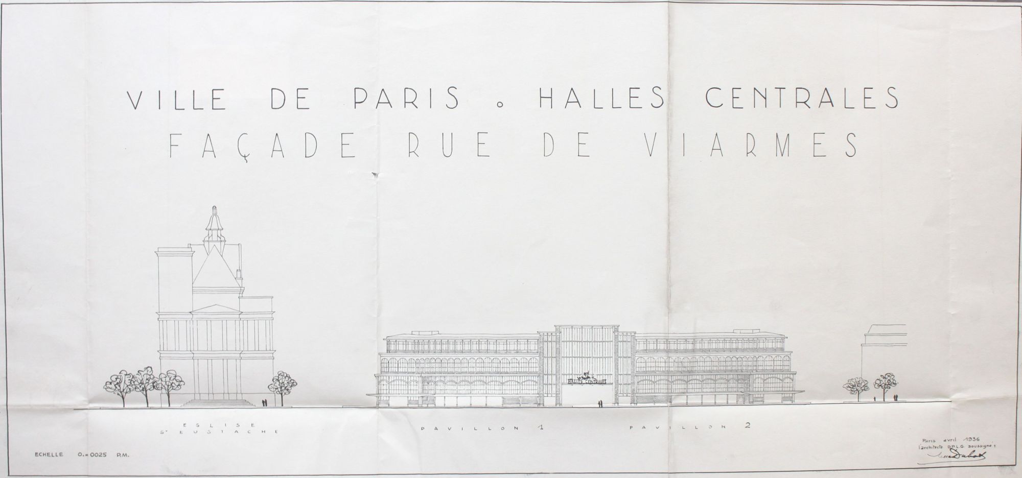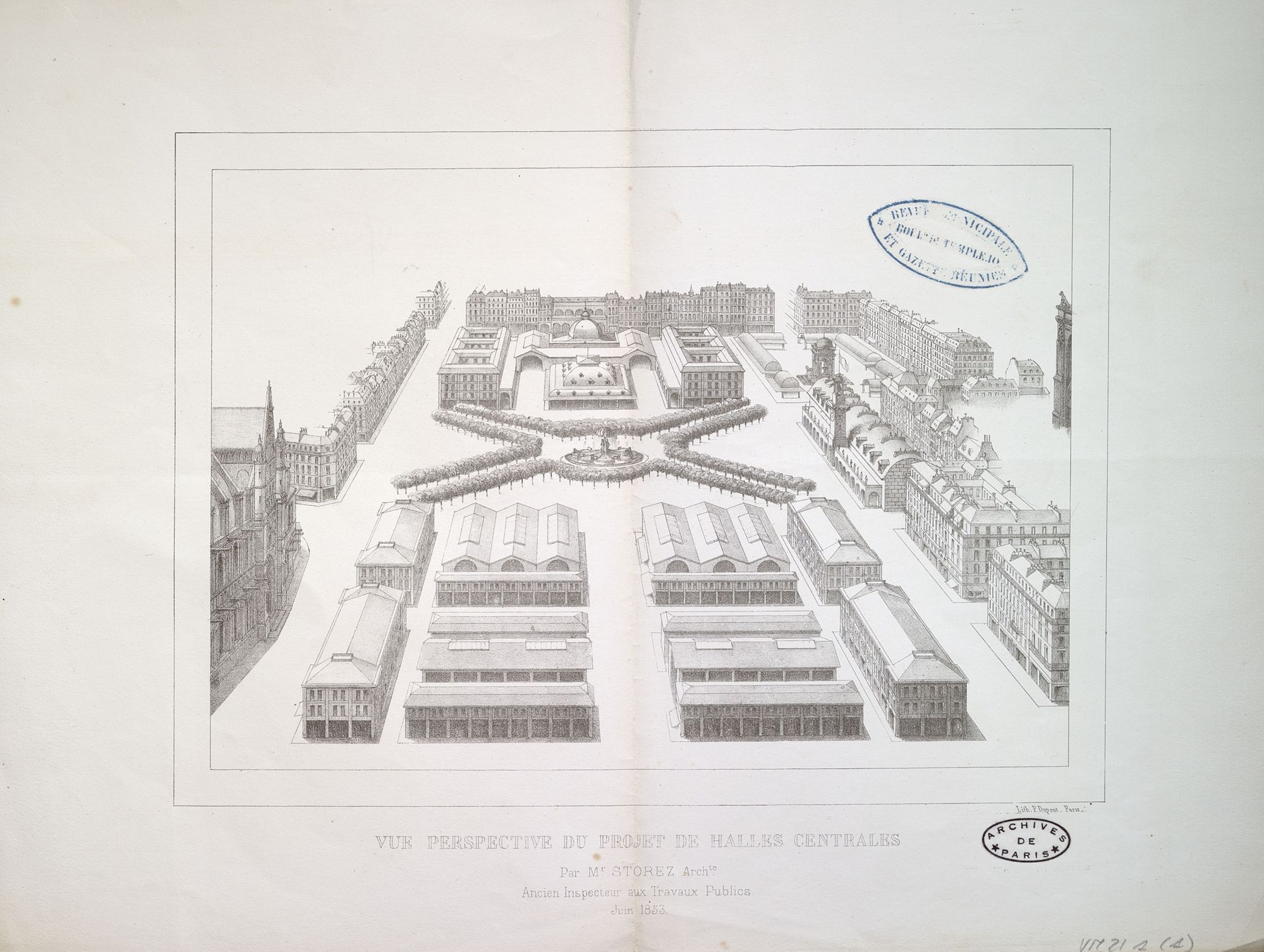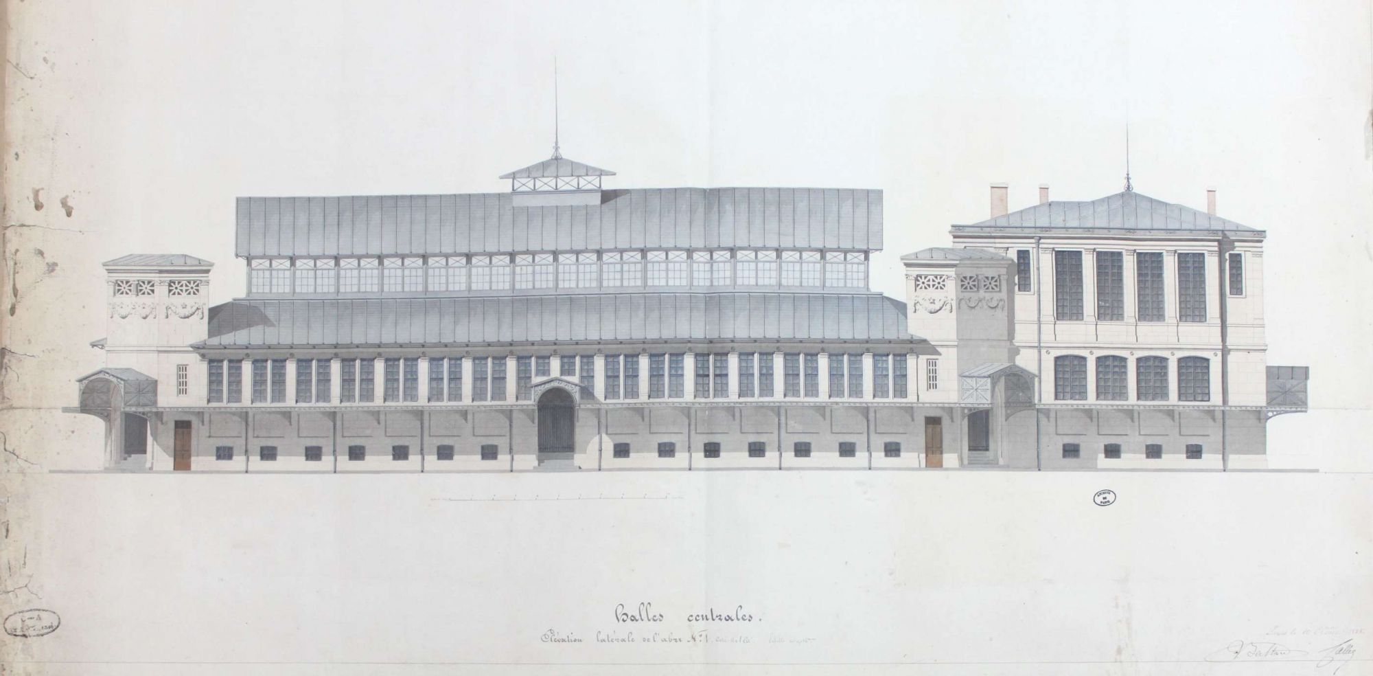 La construction des halles centrales est associée à l’un des plus grands architectes français du XIXe siècle, formé aux Beaux-Arts : Victor Baltard (1805-1874). Soutenu par l’administration parisienne, en particulier par Haussmann, l’un de ses proches amis, il développe de nombreux projets pour les halles. Ses plans seront retenus plusieurs reprises.