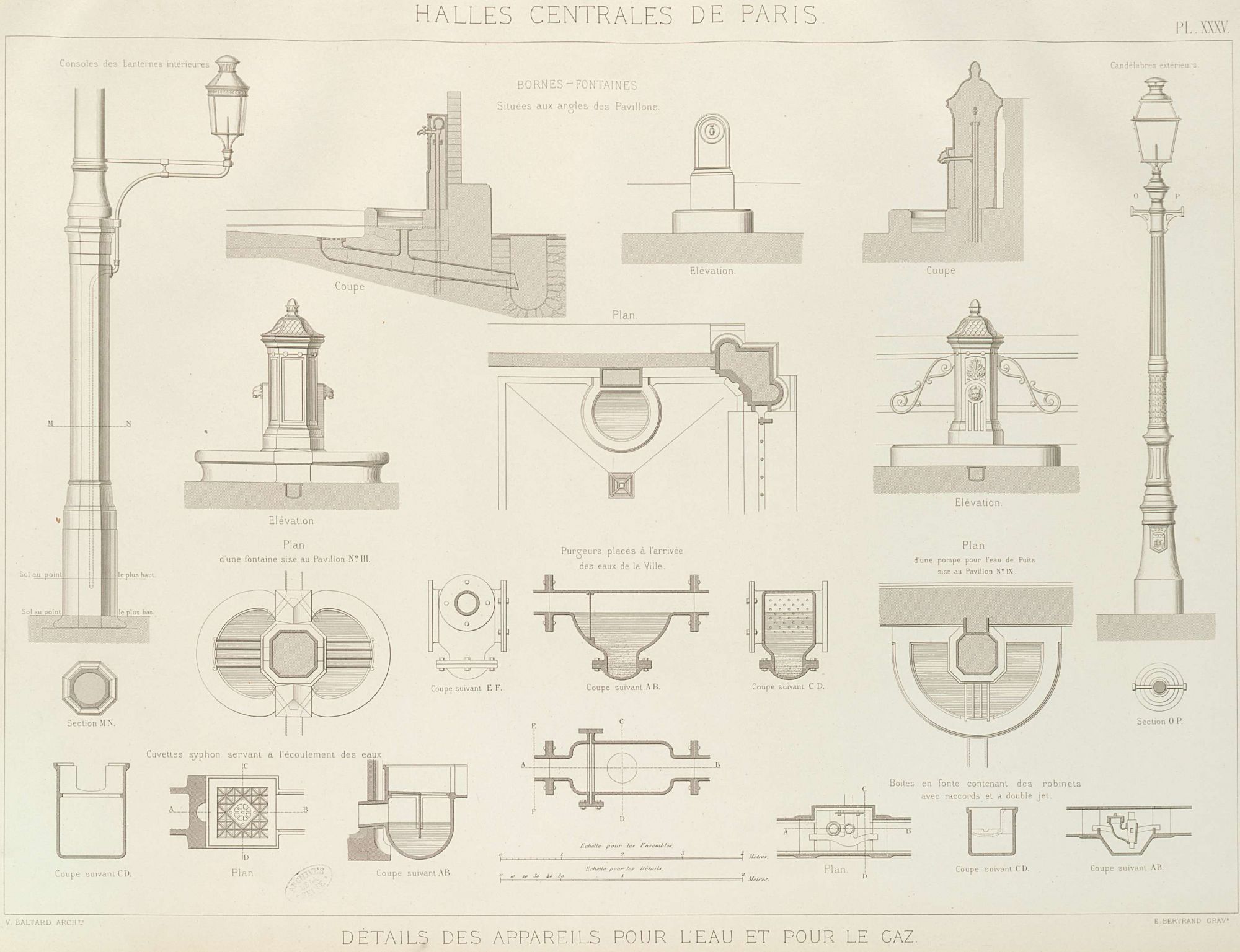 Source principale : Monographie des halles centrales de Paris, Victor Baltard, 1863. Archives de Paris, ATLAS 97 : INHA.