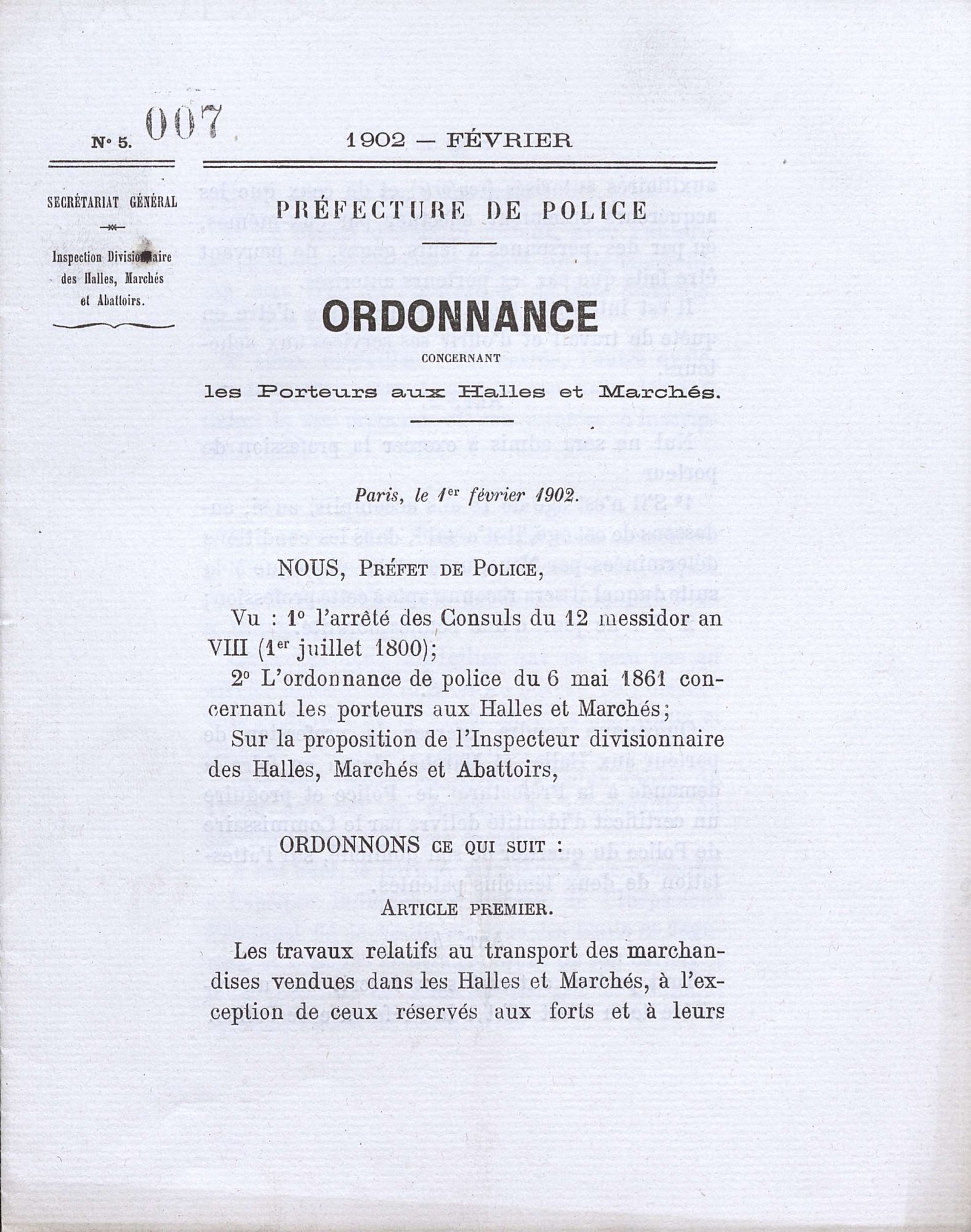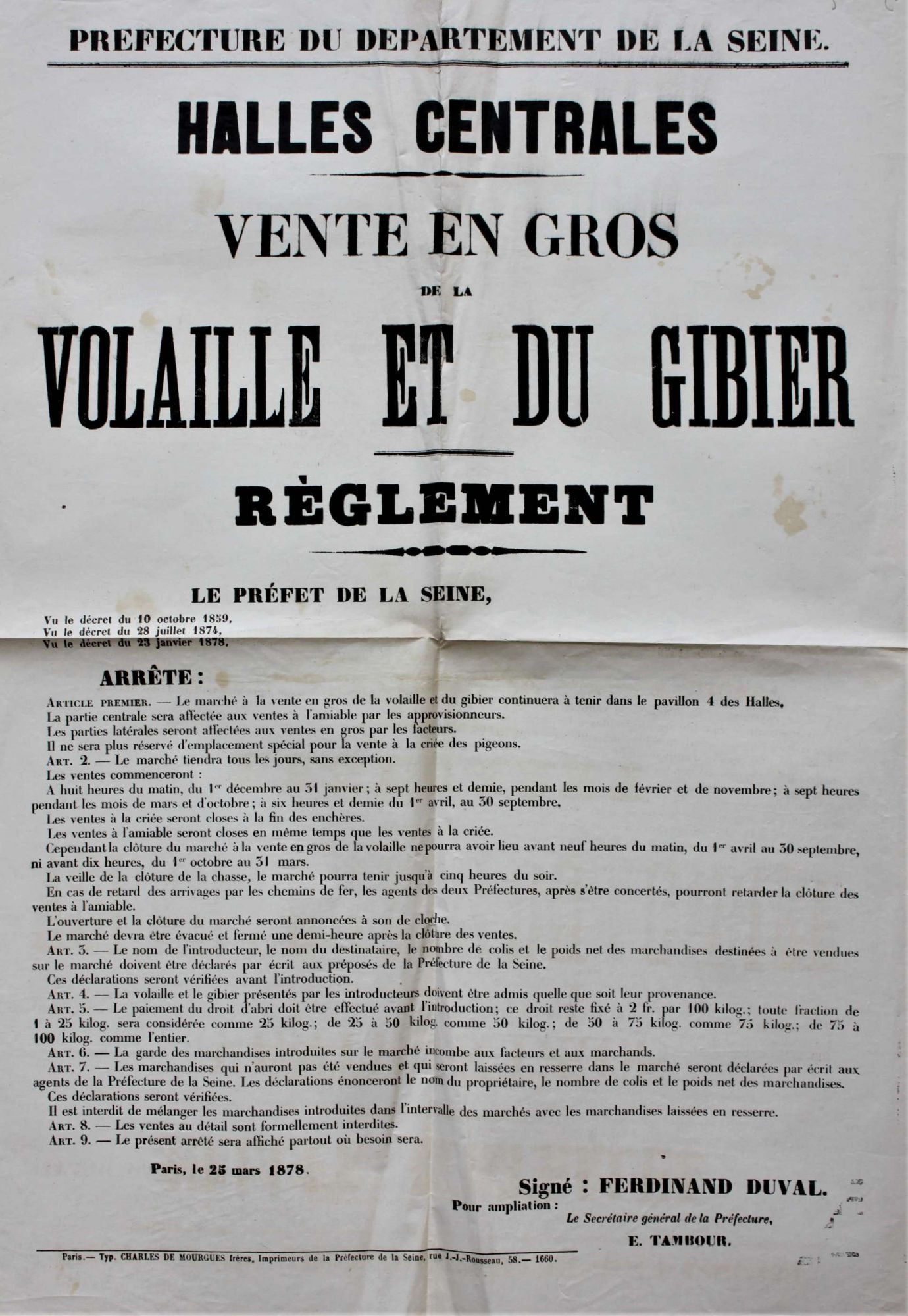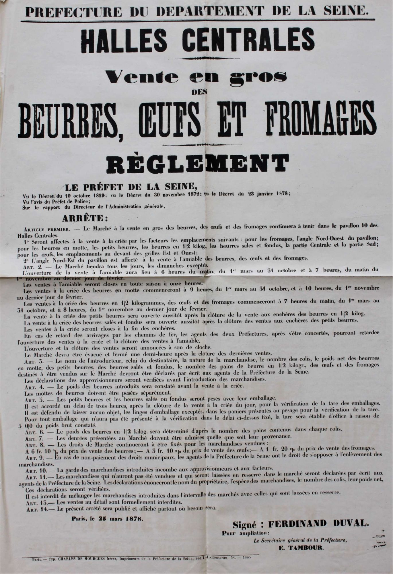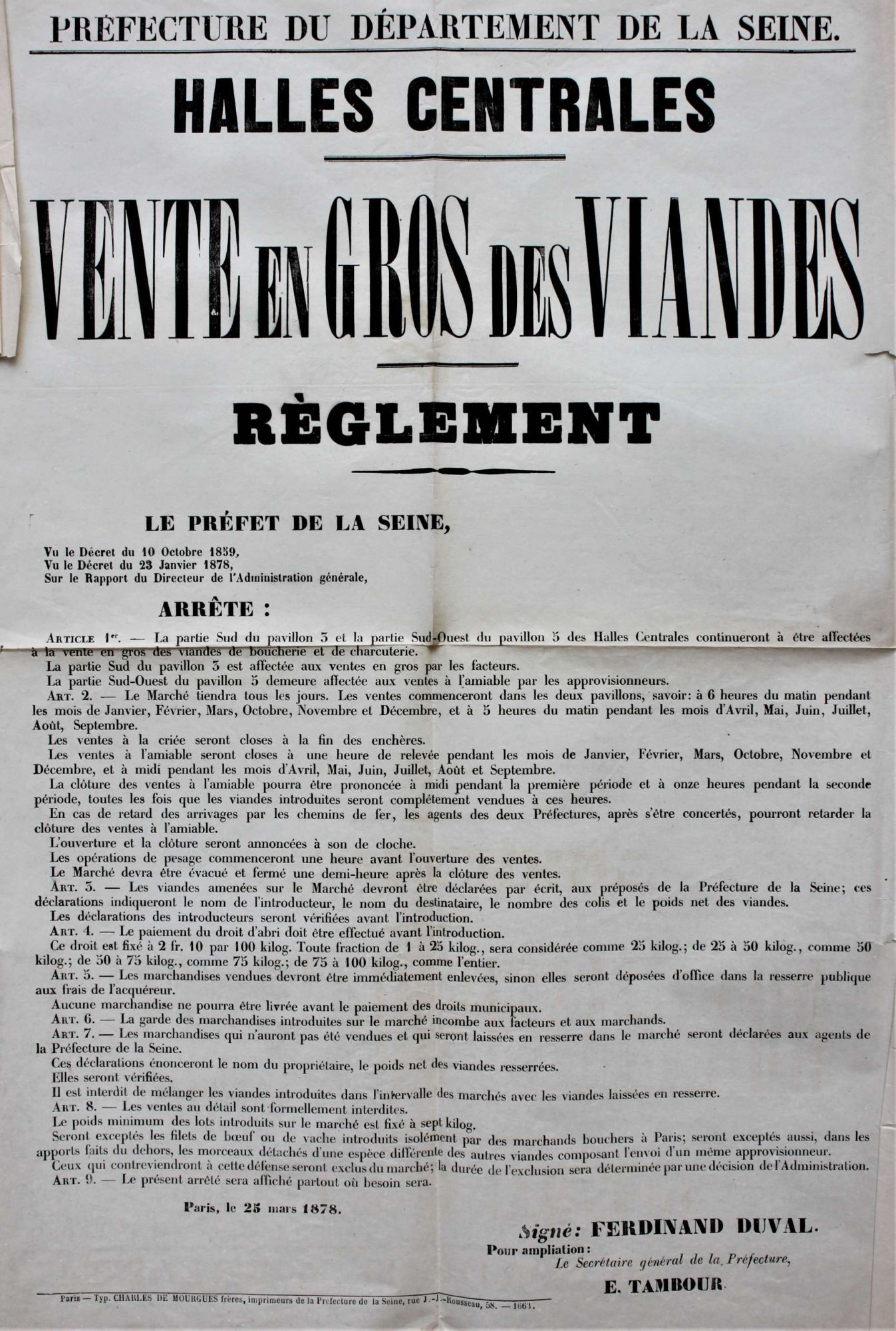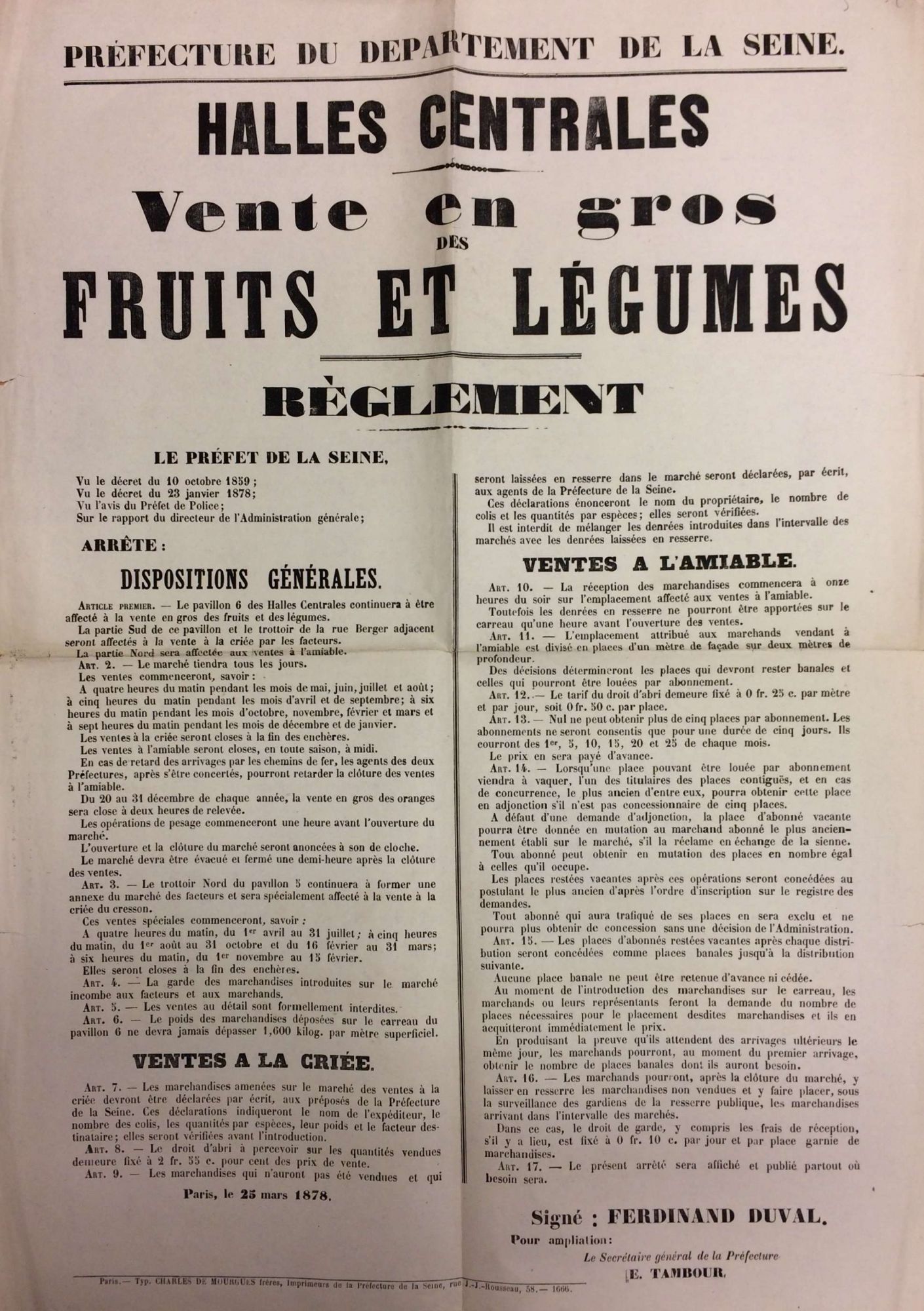 La loi du 11 juin 1896 et le décret du 23 avril 1897 organisent la vente en gros, en demi-gros et au détail des halles sous la double autorité de la préfecture de police et de la préfecture de la Seine.