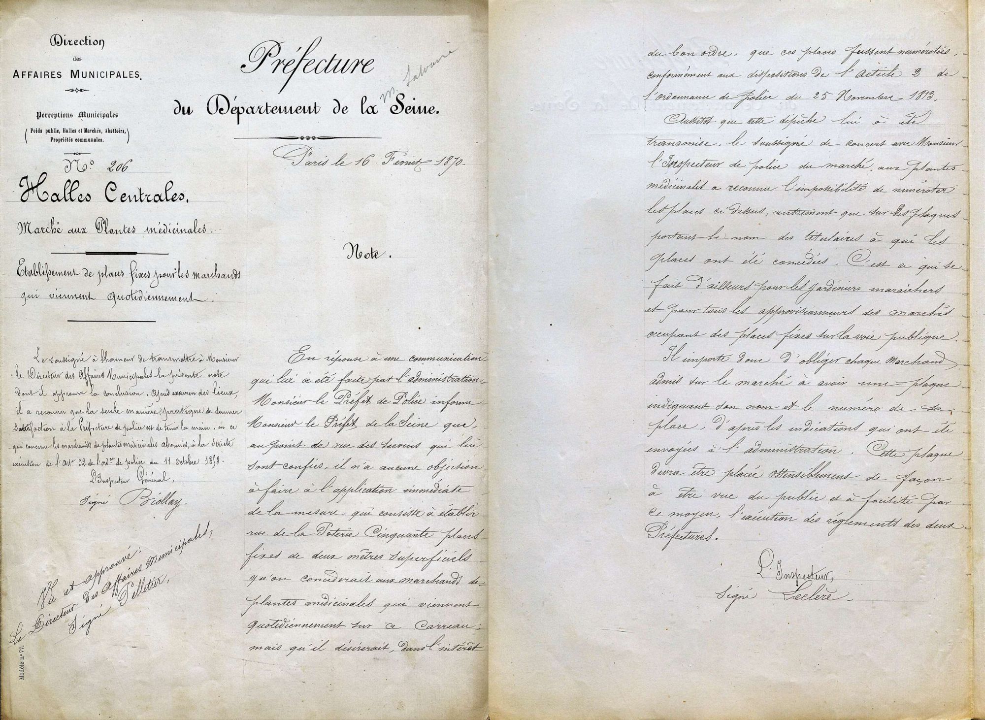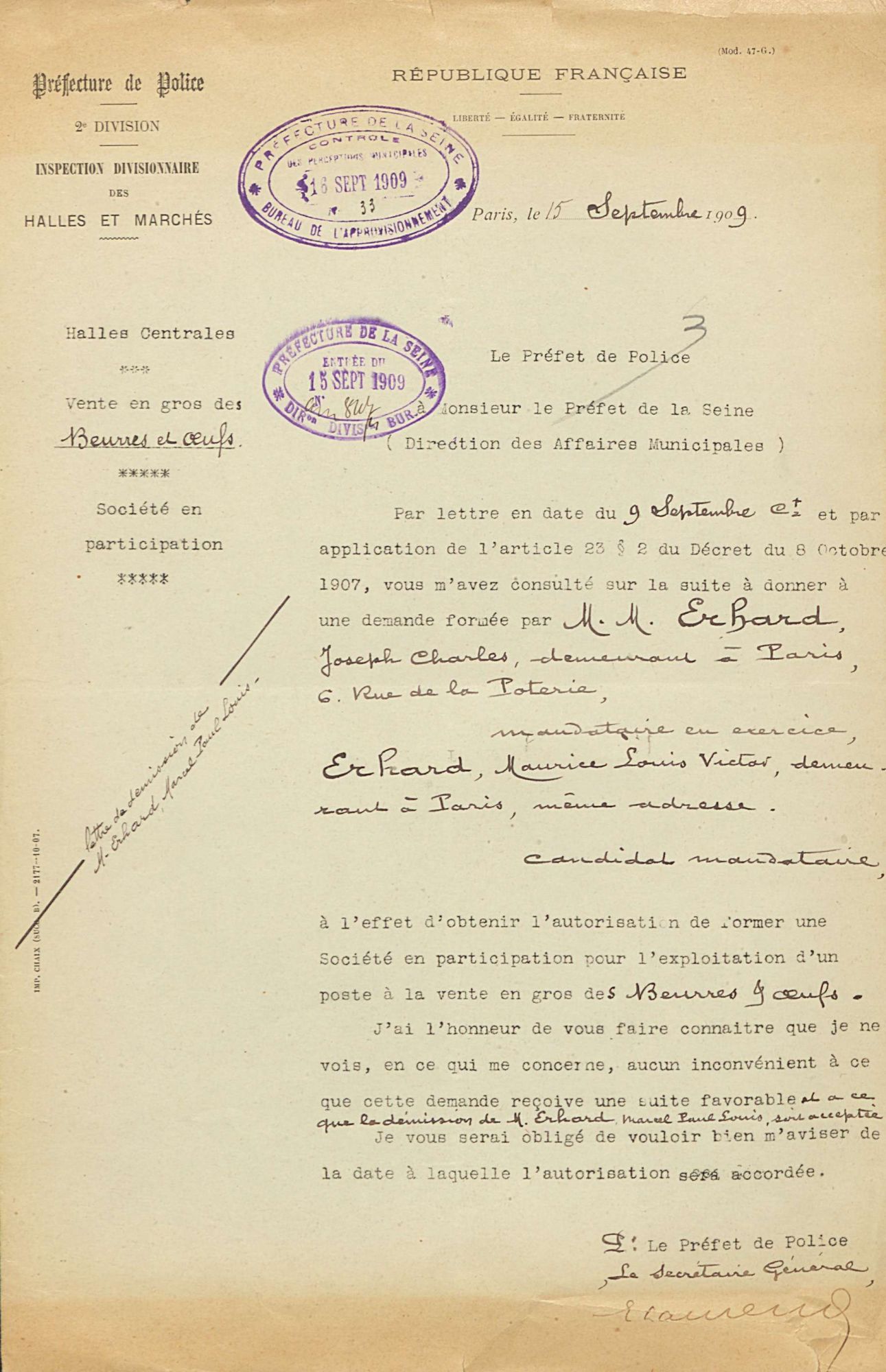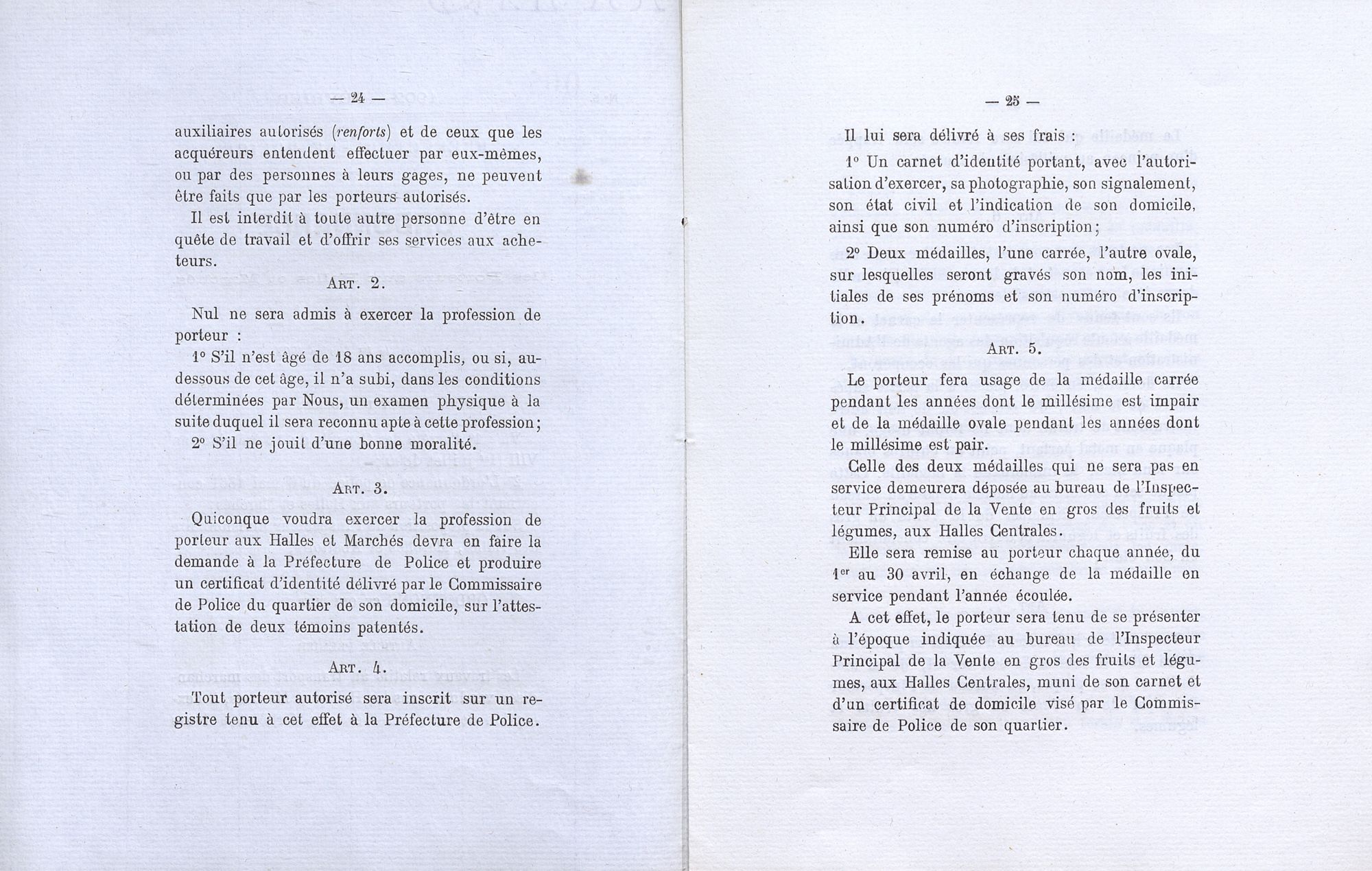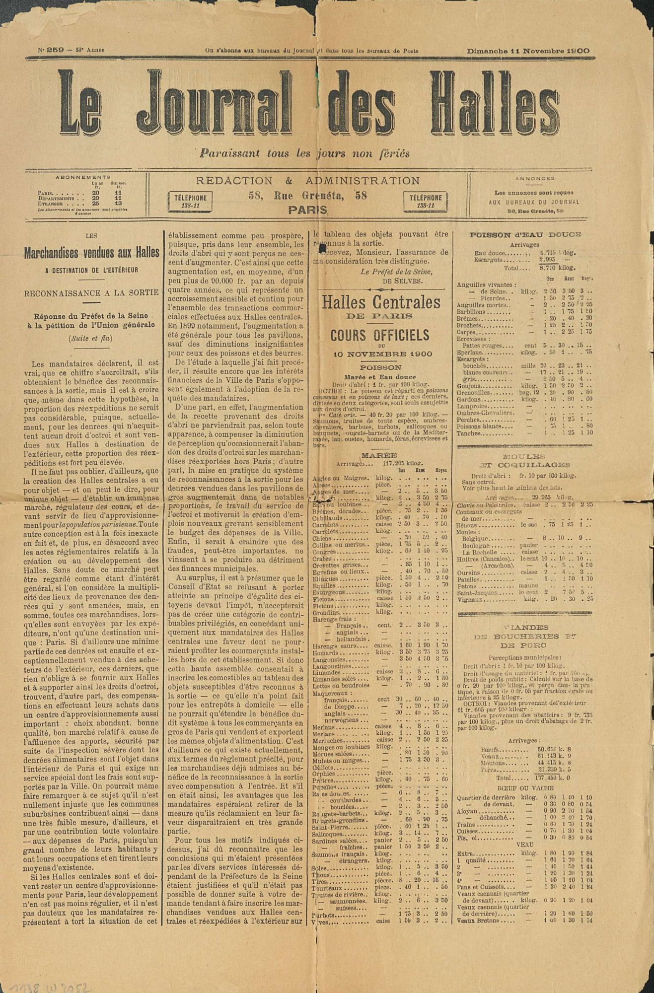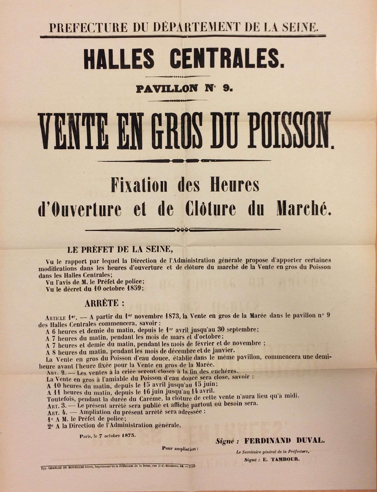 La loi du 11 juin 1896 et le décret du 23 avril 1897 organisent la vente en gros, en demi-gros et au détail des halles sous la double autorité de la préfecture de police et de la préfecture de la Seine.