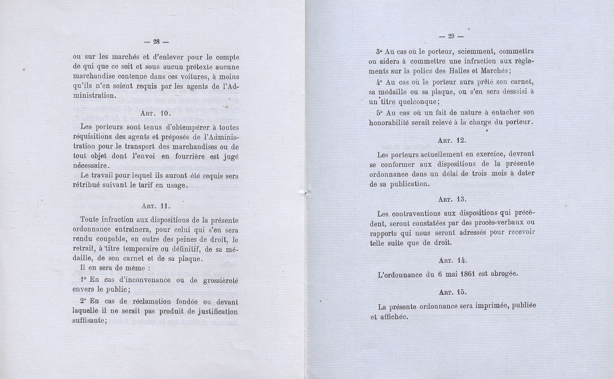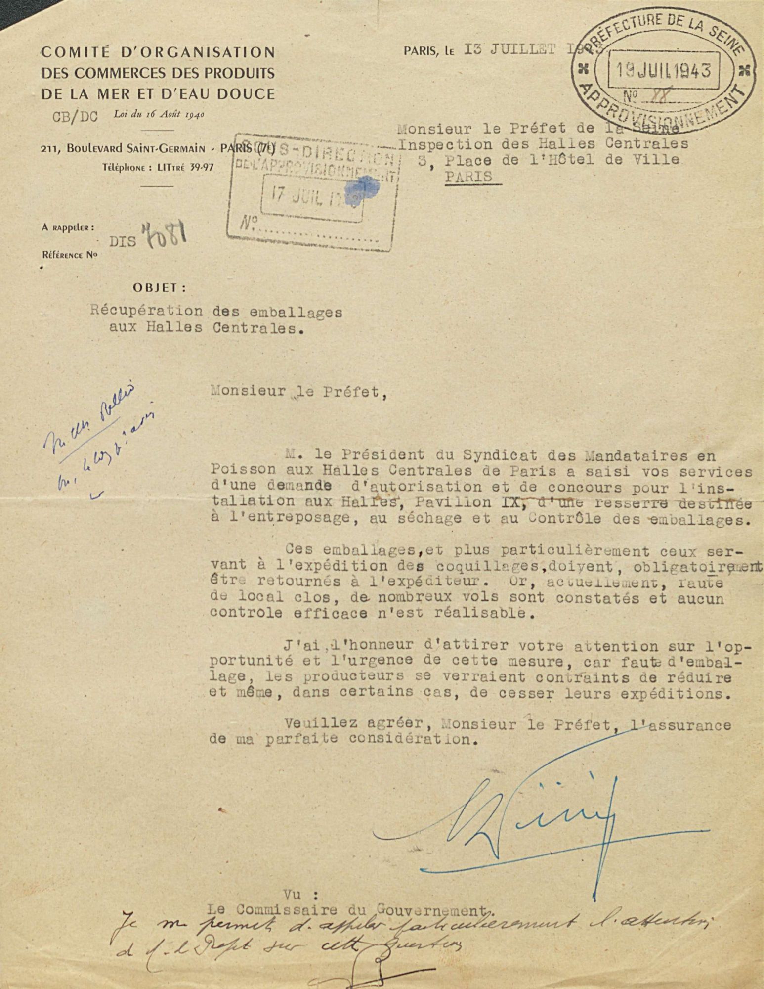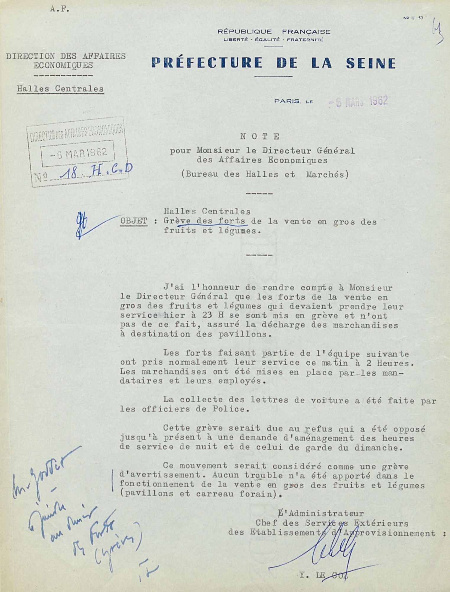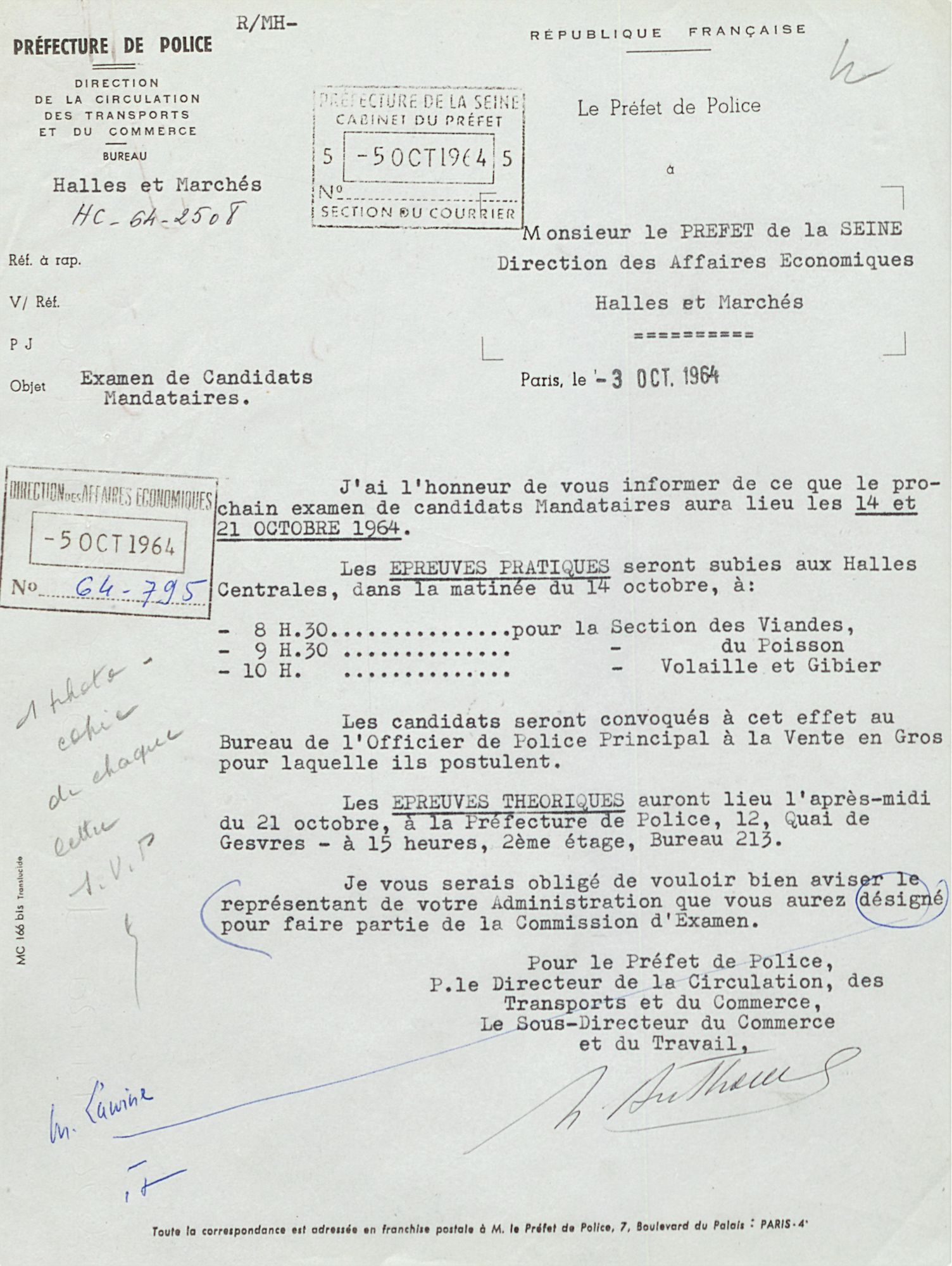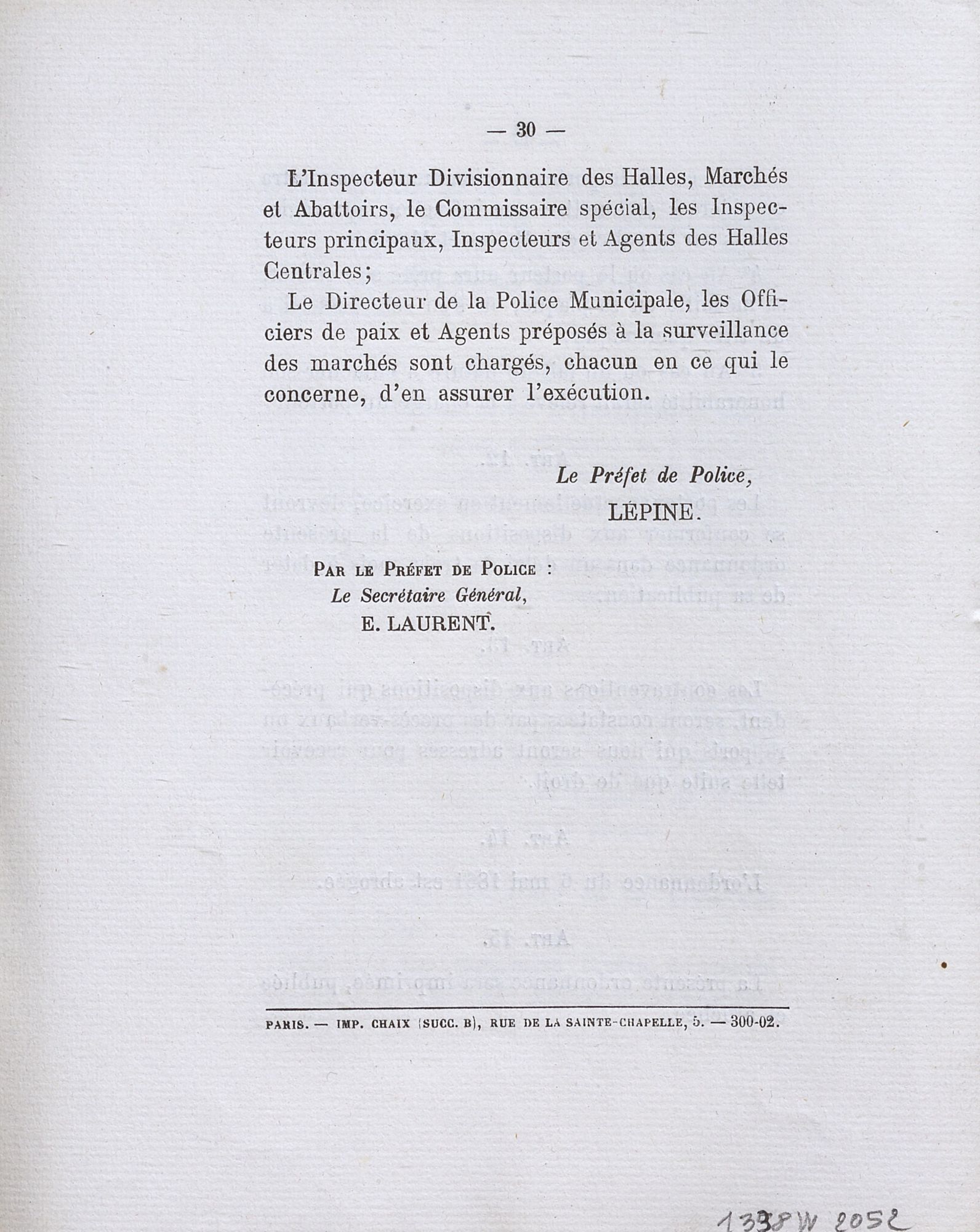 La loi du 11 juin 1896 et le décret du 23 avril 1897 organisent la vente en gros, en demi-gros et au détail des halles sous la double autorité de la préfecture de police et de la préfecture de la Seine.