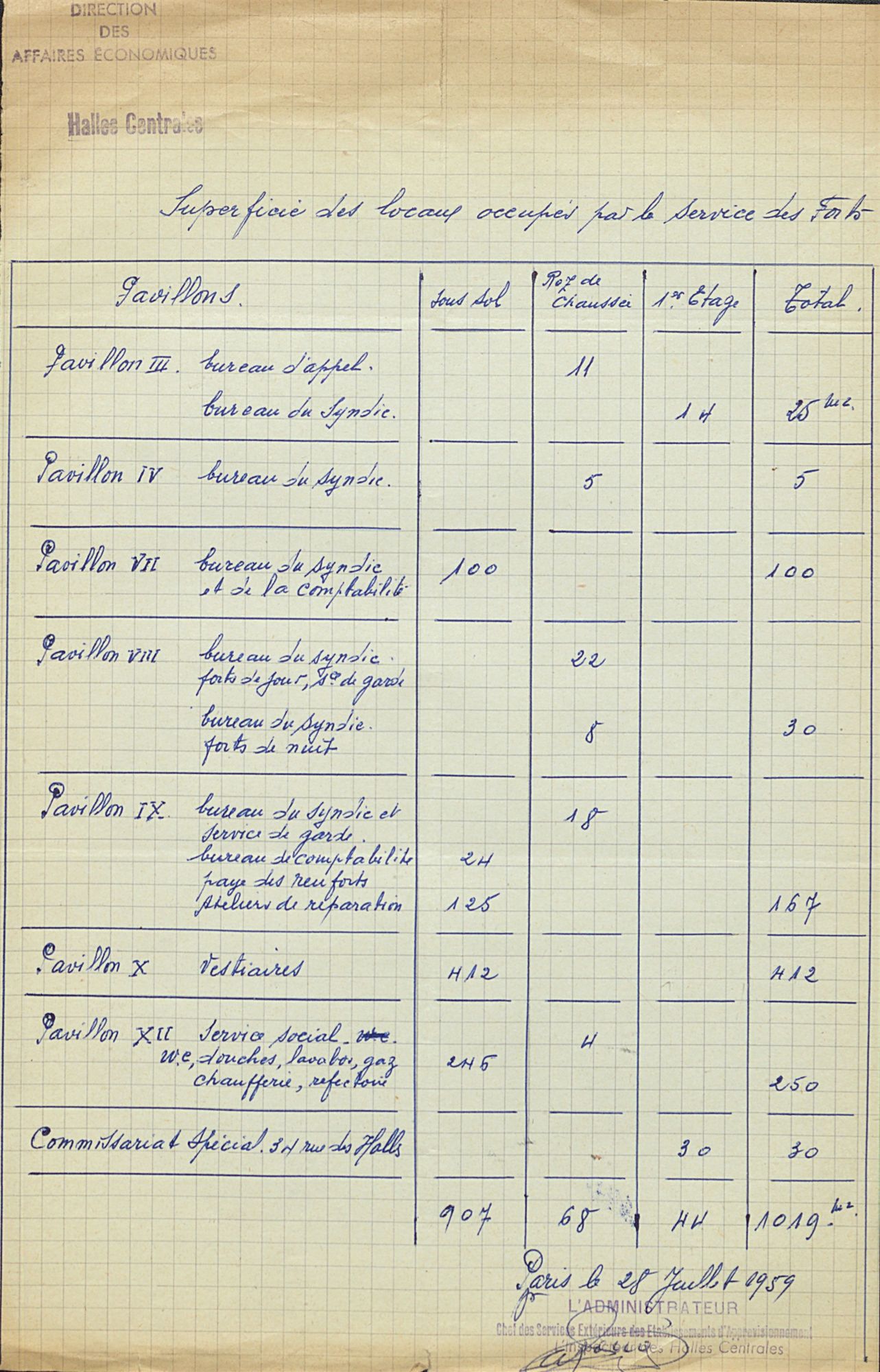 La superficie et l’organisation des halles centrales en fait un lieu de vie et de travail particulier dans la ville avec ses métiers, ses règlements et leur contournement ponctuel. En dehors des modernisations liées aux évolutions des époques (entrepôts frigorifiques, monte-charges plus efficaces, etc.) l’organisation ne change guère durant toute la période.