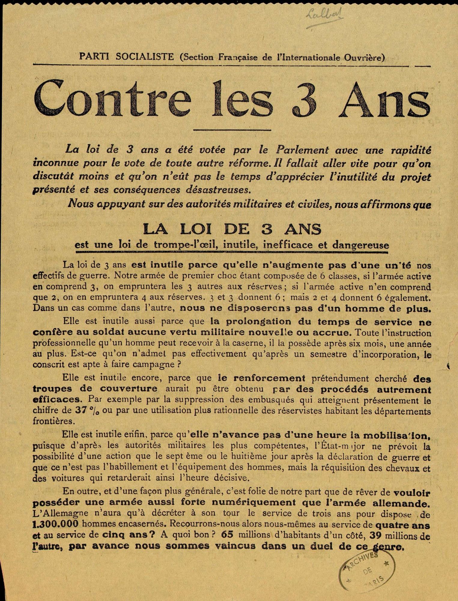 Dès 1913, les discussions à l’Assemblée sur « la loi des trois ans » qui allonge le temps de caserne des jeunes gens de 20 ans, mobilisent les groupes politiques anti-guerre. Jean Jaurès est lui-même très impliqué contre cette loi jugée coûteuse, inutile et socialement destructrice.