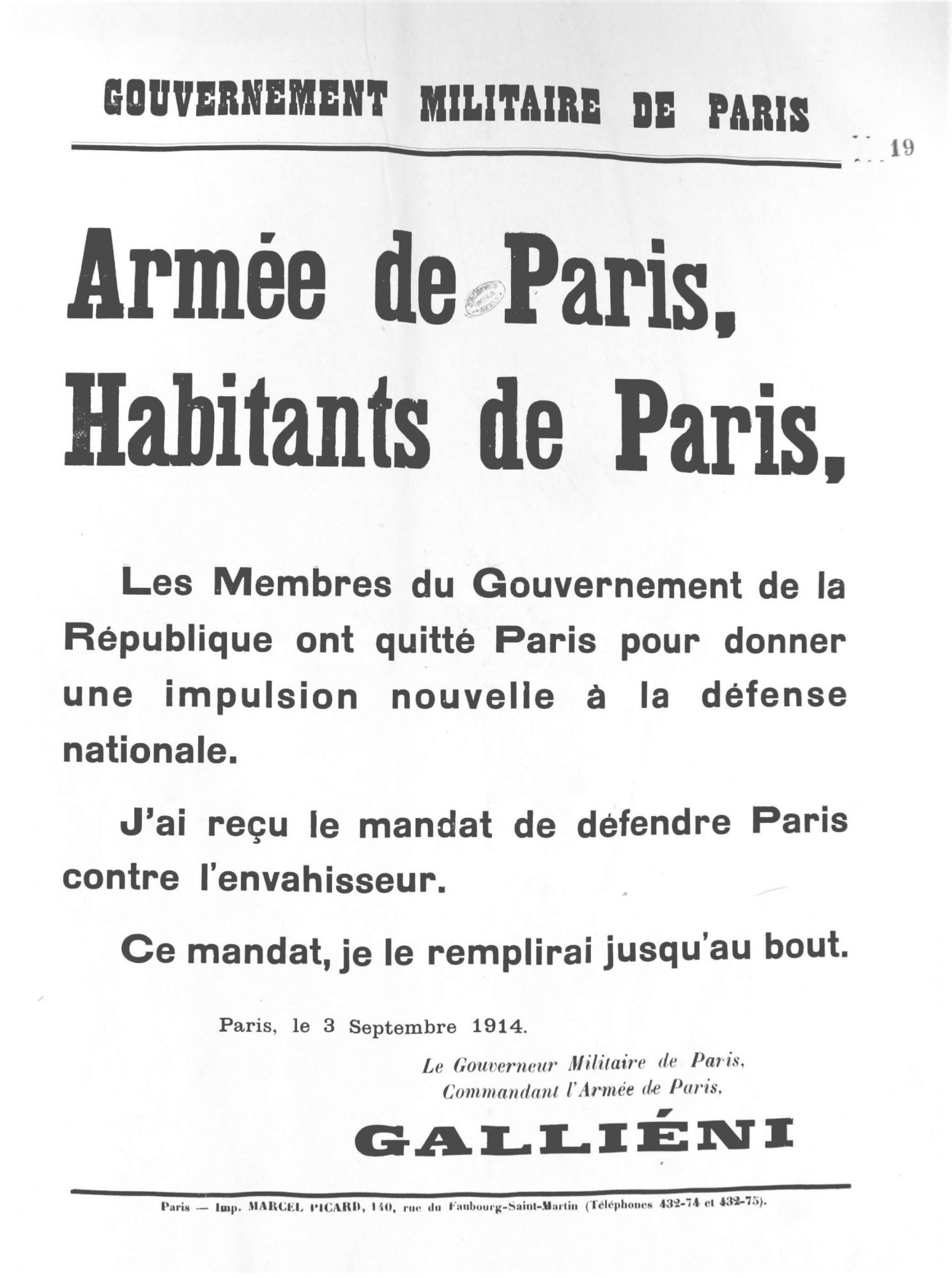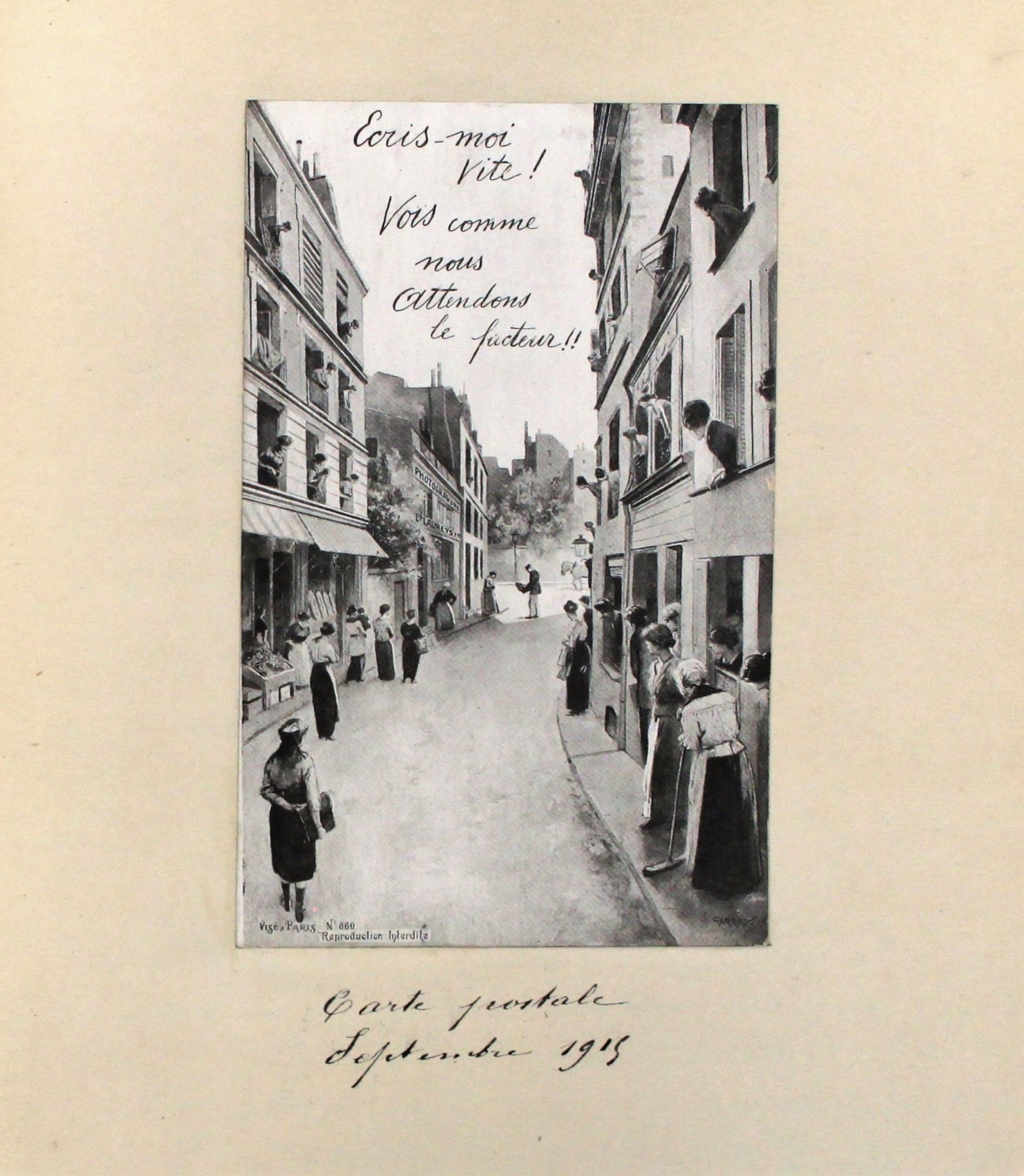 En août 1914, la situation paraît assez confuse à Paris. Les mesures de sécurité militaires et civiles sont mises en place. Mais face aux succès allemands et au départ du gouvernement pour Bordeaux le 2 septembre, la panique s’empare des Parisiens et en une semaine environ ce sont quelques 500 000 personnes qui fuient vers le Sud. La ville se vide et un calme étrange règne dans la capitale. C’est la contre-attaque de la Marne remportée par les Franco-Britanniques le 12 septembre qui interrompt l’avancée allemande et stabilise le Front : les Parisiens qui avaient fui reviennent peu à peu et le 18 octobre le métro rouvre ses lignes.