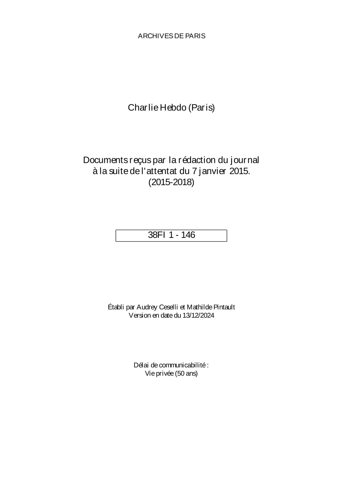 En 2018, Charlie Hebdo a fait don aux Archives de Paris des dessins reçus par la rédaction. Ce fonds d’archives, coté 38Fi, et rassemblant 146 articles, n’est librement communicable qu’à l’issue d’un délai de 50 ans qui vise à protéger la vie privée des auteurs de ces documents.