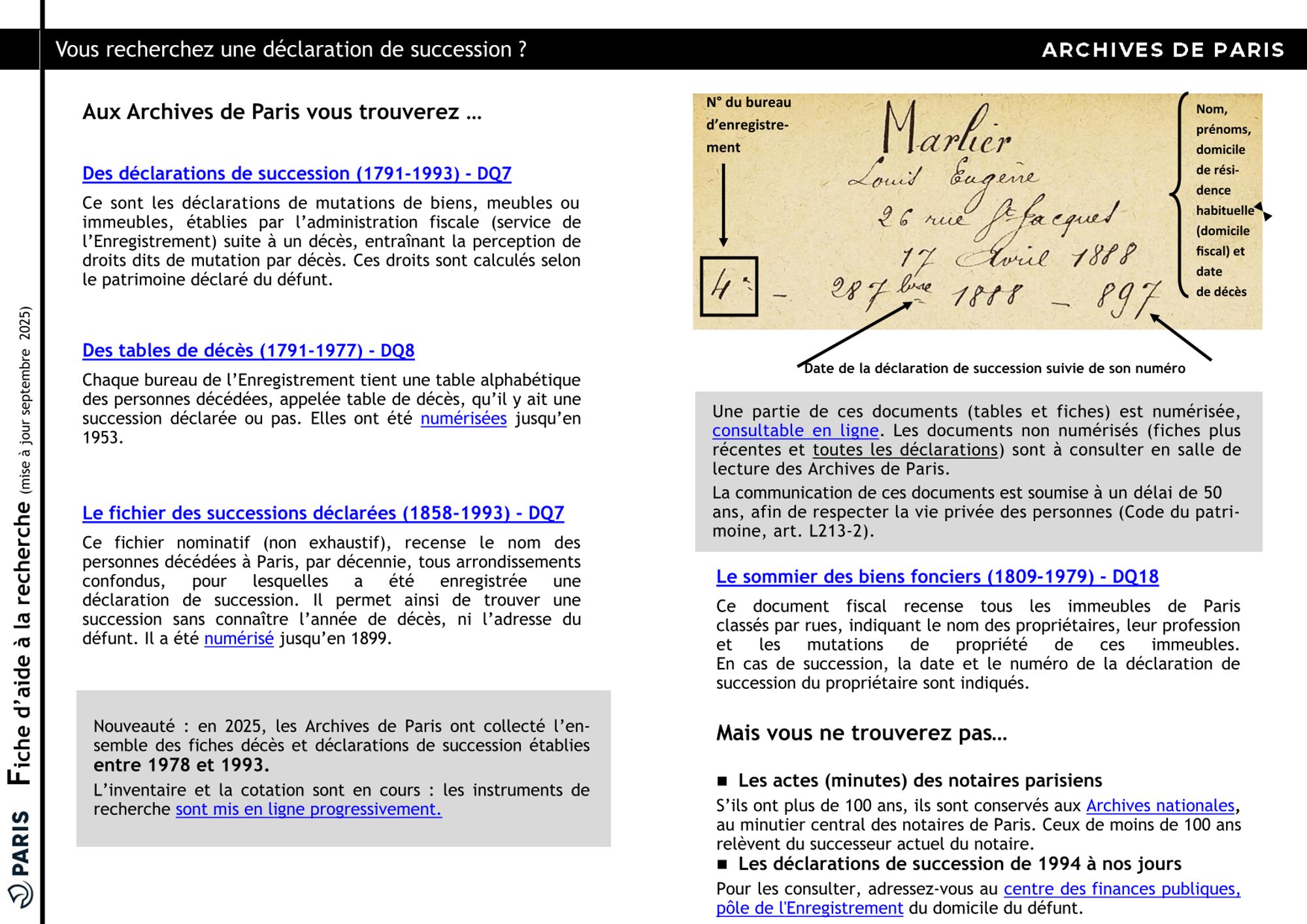 Fiscalité / Enregistrement / Hypothèques Rechercher une déclaration de succession après décès (350.6 Ko) Rechercher une transcription hypothécaire (7.3 Mo) Retrouver une déclaration de succession dans une commune annexée (594.0 Ko) Rechercher l'usage d'un local (211.6 Ko)