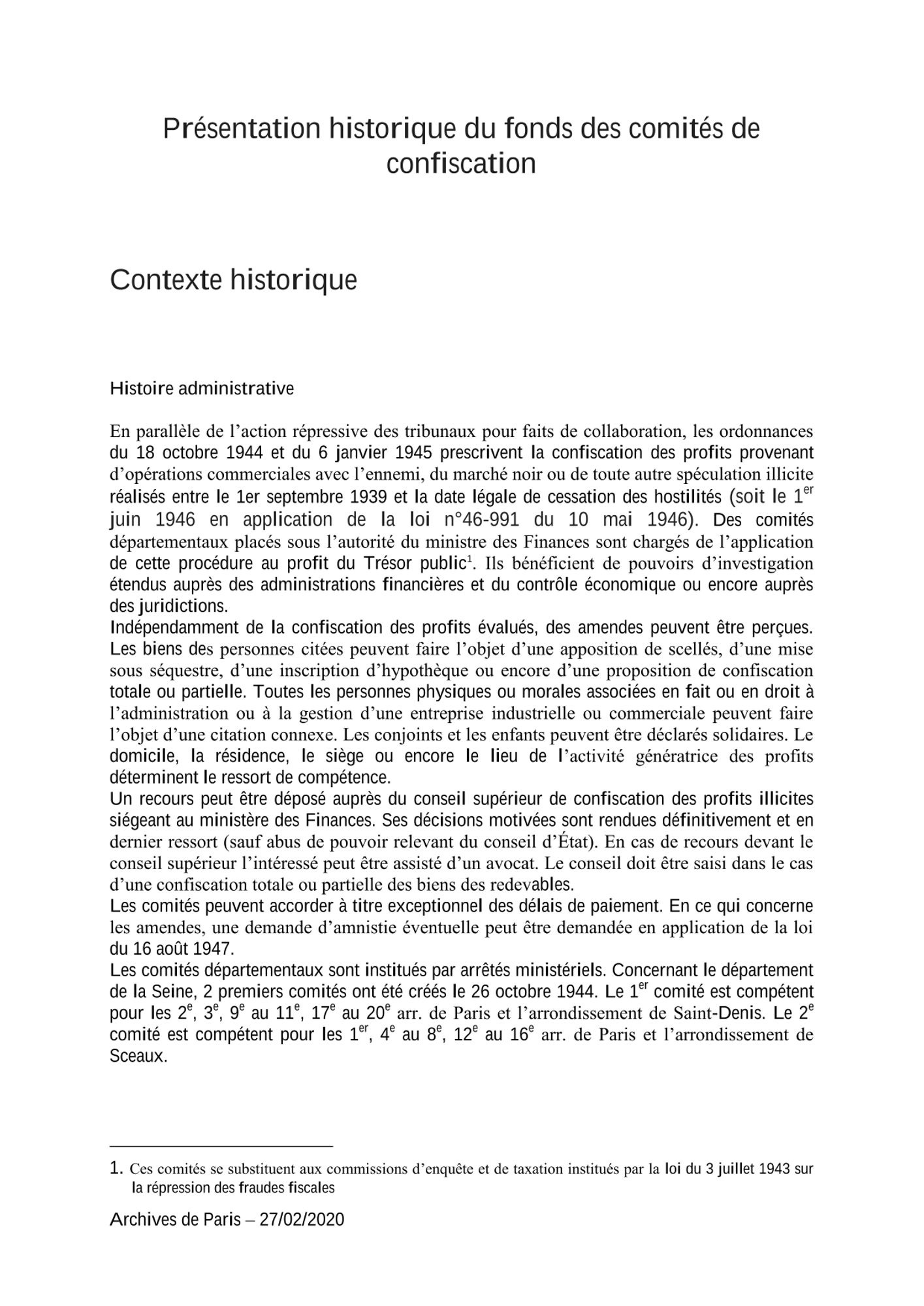 Les 12 comités départementaux de confiscation des profits illicites du département de la Seine, placés sous l'autorité du ministre des Finances, ont été chargés de l'application des ordonnances du 18 octobre 1944 et du 6 janvier 1945 prescrivant la confiscation des profits provenant d'opérations commerciales avec l'ennemi, du marché noir ou de toute autre spéculation illicite réalisés entre le 1er septembre 1939 et la date légale de cessation des hostilités (soit le 1er juin 1946 en application de la loi n°46-991 du 10 mai 1946).