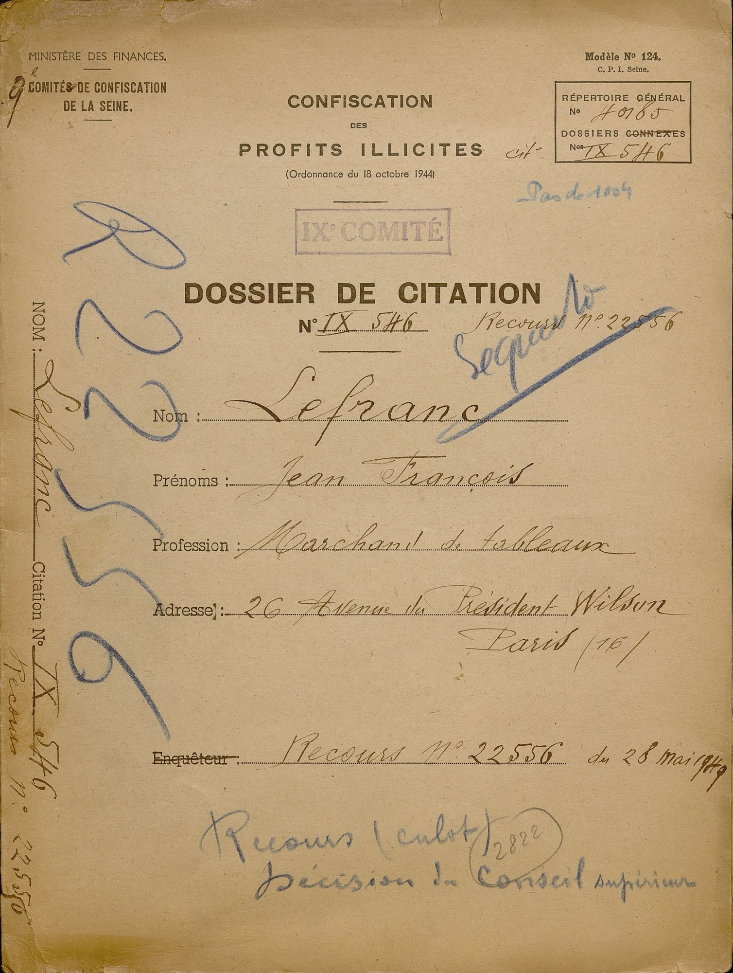 * Le fonds d'archives du conseil supérieur de confiscation des profits illicites, organisme de recours des décisions des comités départementaux de confiscation des profits illicites est conservé au service des archives économiques et financières du ministère des Finances (SAEF) https://www.economie.gouv.fr/saef